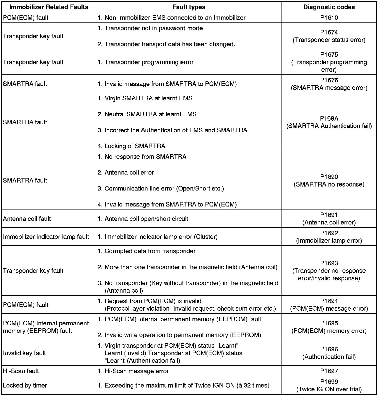 The following table shows the assignment of immobilizer related faults to each type: