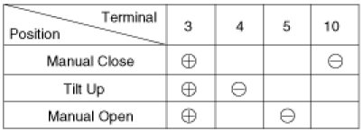 5. Ground the terminals as below table, and check that the sunroof unit operates as below table.