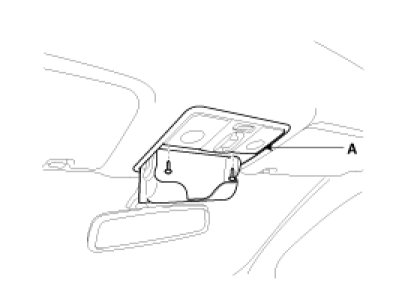 2. Open the sunglass case cover from the overhead console then remove the 2 screws holding the overhead console. Disconnect the switch connector and then remove the overhead console lamp(A).