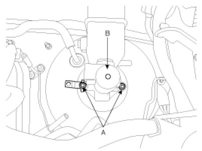 7. Remove the master cylinder (B) from the brake booster after loosening the mounting nuts (A).