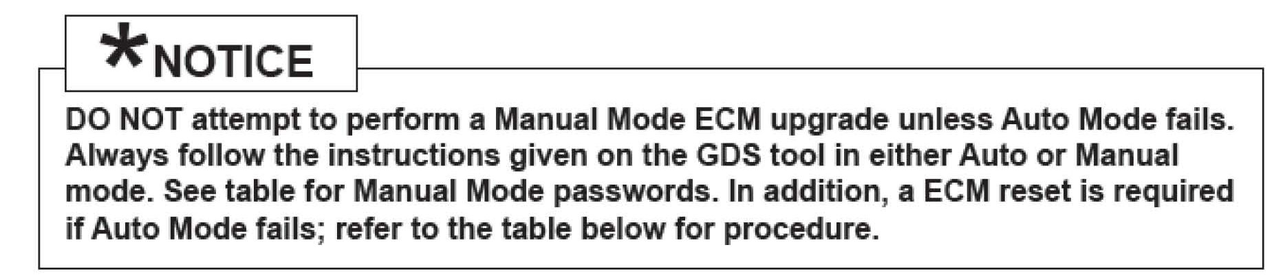 * Do NOT perform Manual Mode ECM upgrade unless Auto Mode fails.
