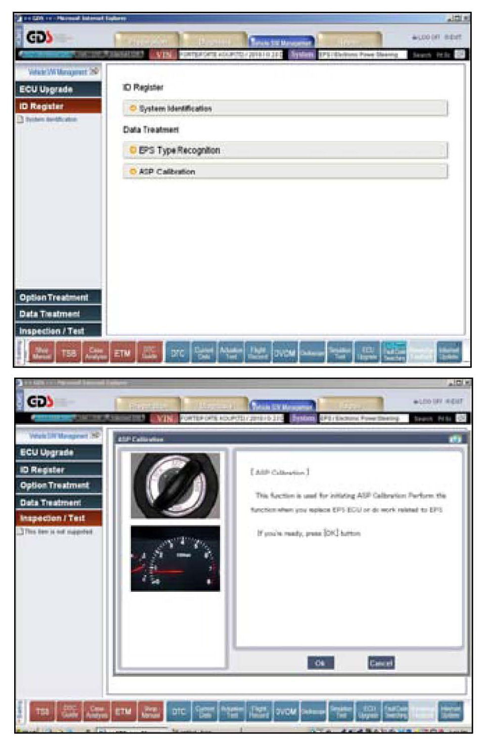 5. With the ignition key ON, turn ON the VCI and GDS tool. Access the GDS vehicle identification number (VIN) screen and configure the vehicle using the VIN AUTO DETECT Function.