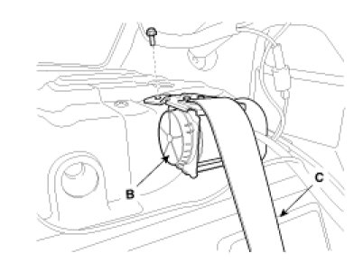 5. After loosening the retractor (B) mounting bolt, remove the rear seat belt (C).