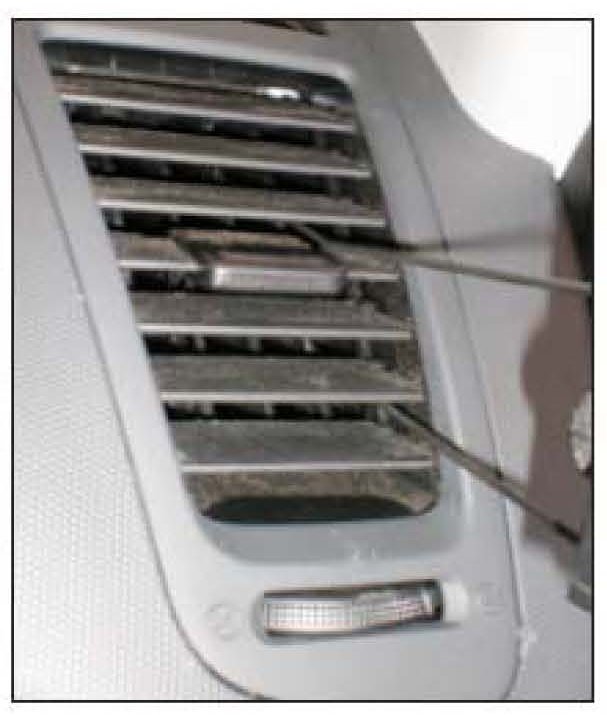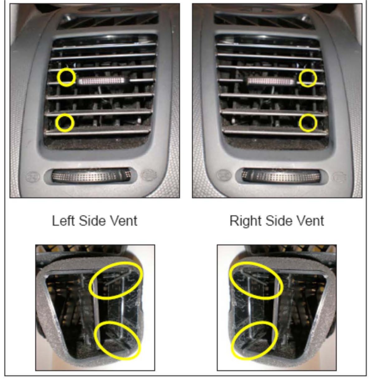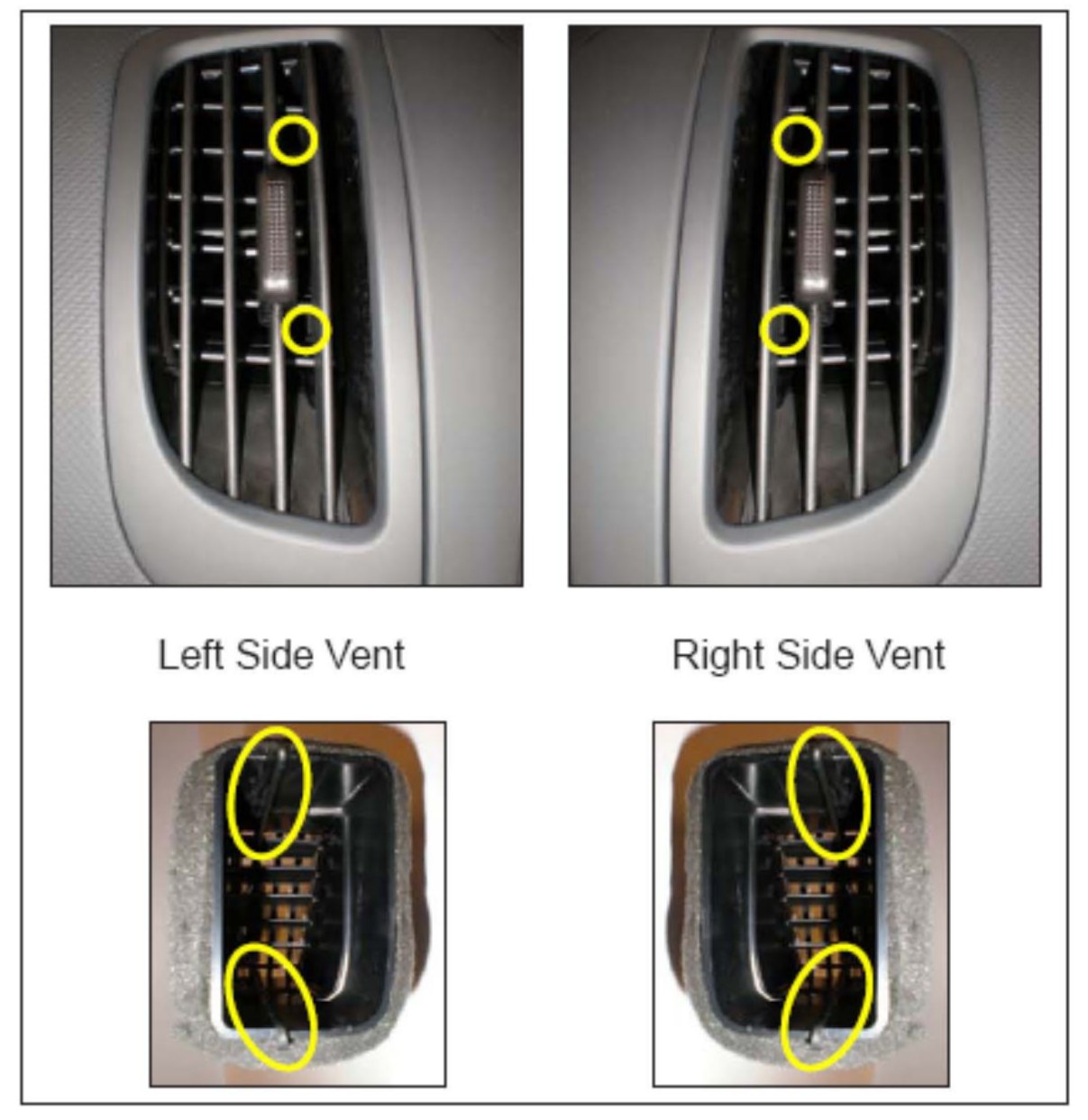 3. Insert the Air Vent Remover (09840-1M100) into the air vent as marked. Note the circles indicating the best areas in which to insert the tool to remove the vent. The tool should be inserted toward the outward side of the vent. The tool should be placed between the far outside vertical vent and the link for the horizontal vents.