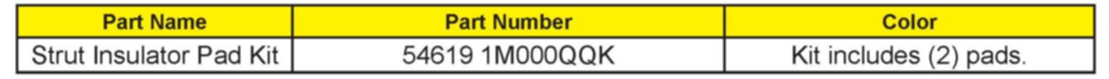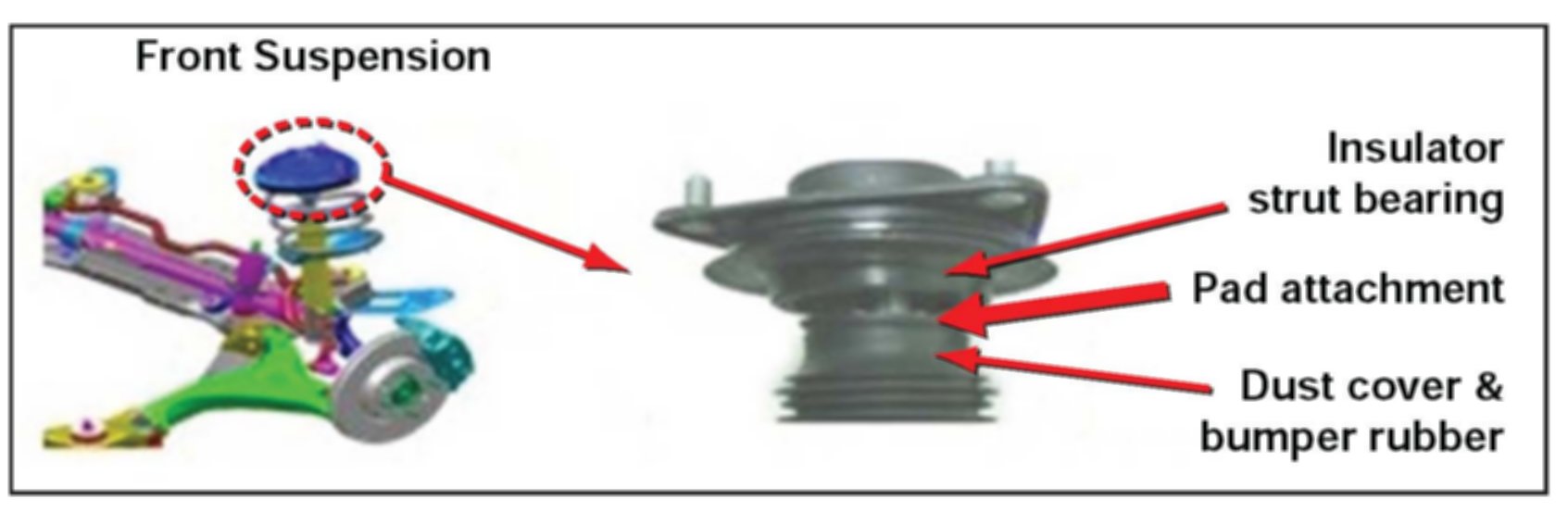 This bulletin provides information relating to some Forte (TD) vehicles built from March 3, 2009 to March 18, 2010 that may exhibit abnormal noise from the front strut(s) while driving over a speed bump or similar road conditions during the winter months. This concern is caused by interference between insulator strut bearing and dust cover bumper rubber. To correct this condition a strut insulator pad will need to be installed on the bottom of the insulator strut bearing assembly contact surface. This procedure will need to be performed on both L/R front struts.