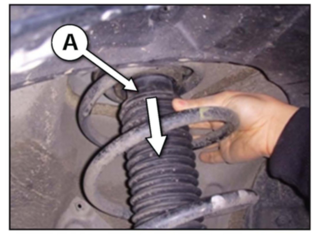 2. Pull down the front strut dust cover and bumper rubber (A) as shown in the photo.