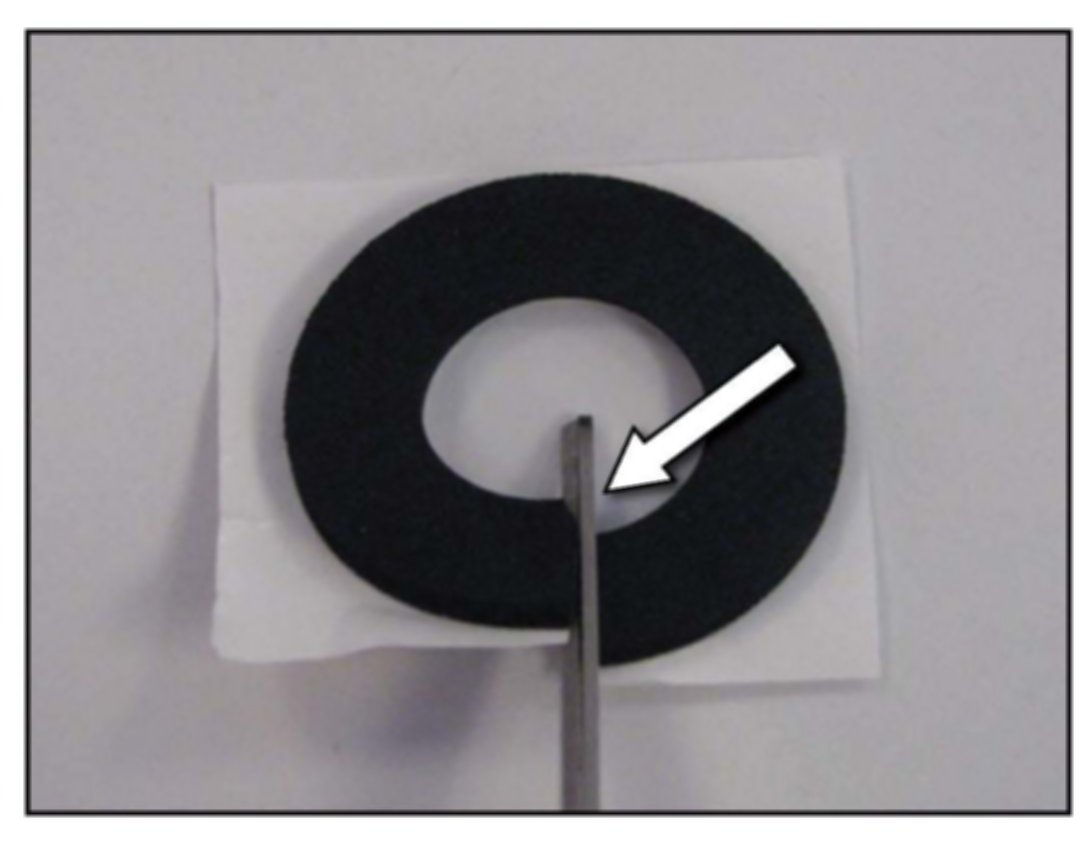 4. Use a pair of scissors to make a cut across one side of the strut insulator pad as indicated by the arrow.