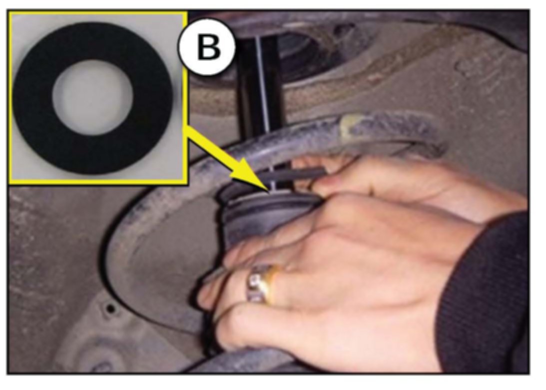6. Place the strut insulator pad (B) on the top of the dust cover bumper rubber with the adhesive side of the pad facing upward.
