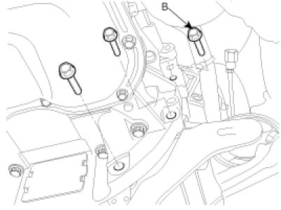 17. Install the transaxle upper mounting bolts (A-2ea) and the starter motor mounting bolts (B-2ea).