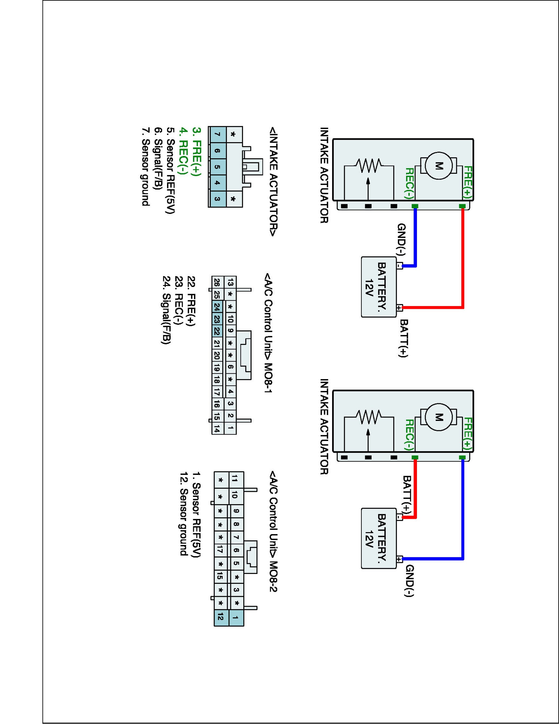 3. Connect (+) terminal of battery to FRE (+) of intake actuator and (-) terminal to REC (-). (Component side)