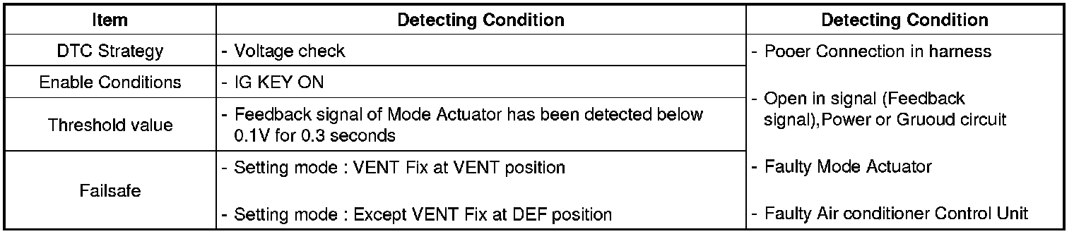Air conditioner Control Module sets DTC B1249 if Feedback signal of Mode Actuator has been detected below 0.1 V for 0.3 seconds