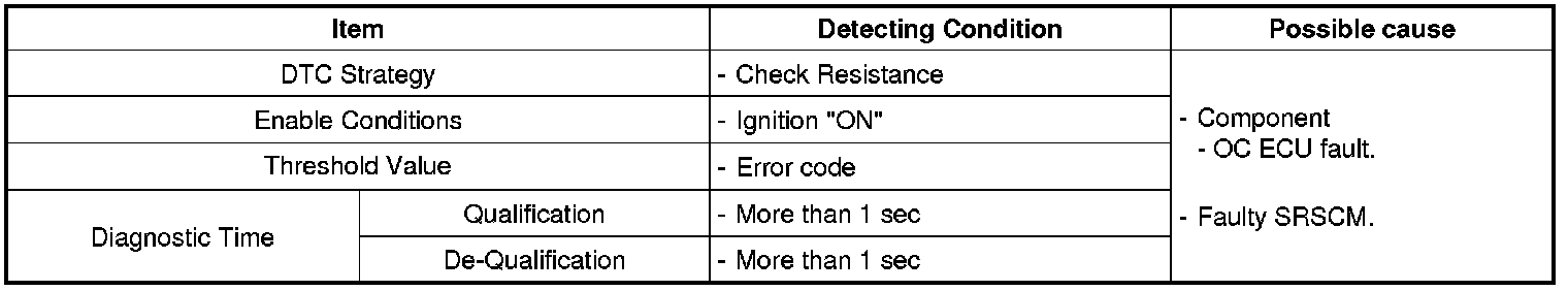 The SRSCM sets above Diagnosis trouble code if it detects that the Passenger OC system ECU unit is defected.