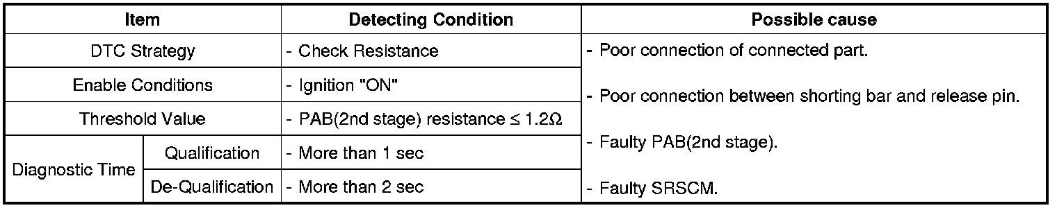 The SRSCM sets DTC B1486 if the measured resistance value of PAB circuit is less than the threshold value.