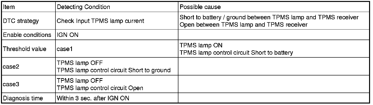This DTC indicates that the TPMS lamp control circuit short to battery when lamp is on.