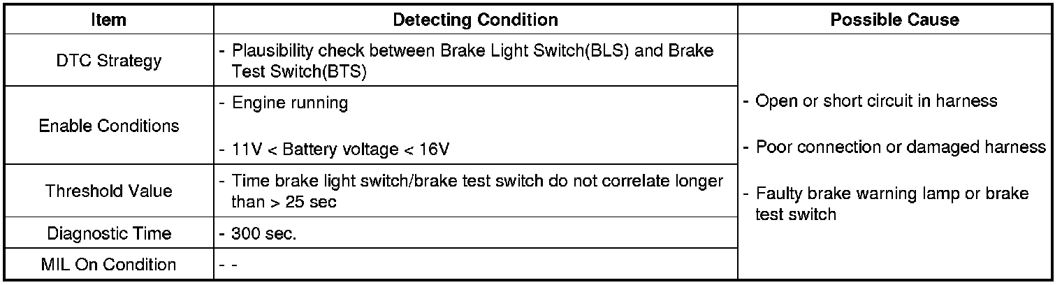 PCM sets DTC P0504 if the PCM detects signal of the brake warning lamp and brake switch do not correlate within the predetermined time.