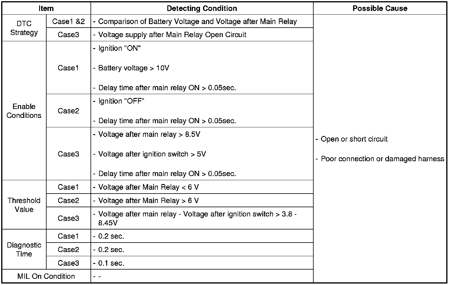 The PCM measures the voltage from ignition key and from main relay respectively and compares two voltages. This comparison will watch if the Main Relay has switched and remains on after ignition Key-On and if it has switched off after the ignition Key-Off. The PCM sets DTC P0560 if the voltage after Main Relay is lower than a predetermined threshold after ignition key-on or higher than a predetermined threshold after ignition key-off.