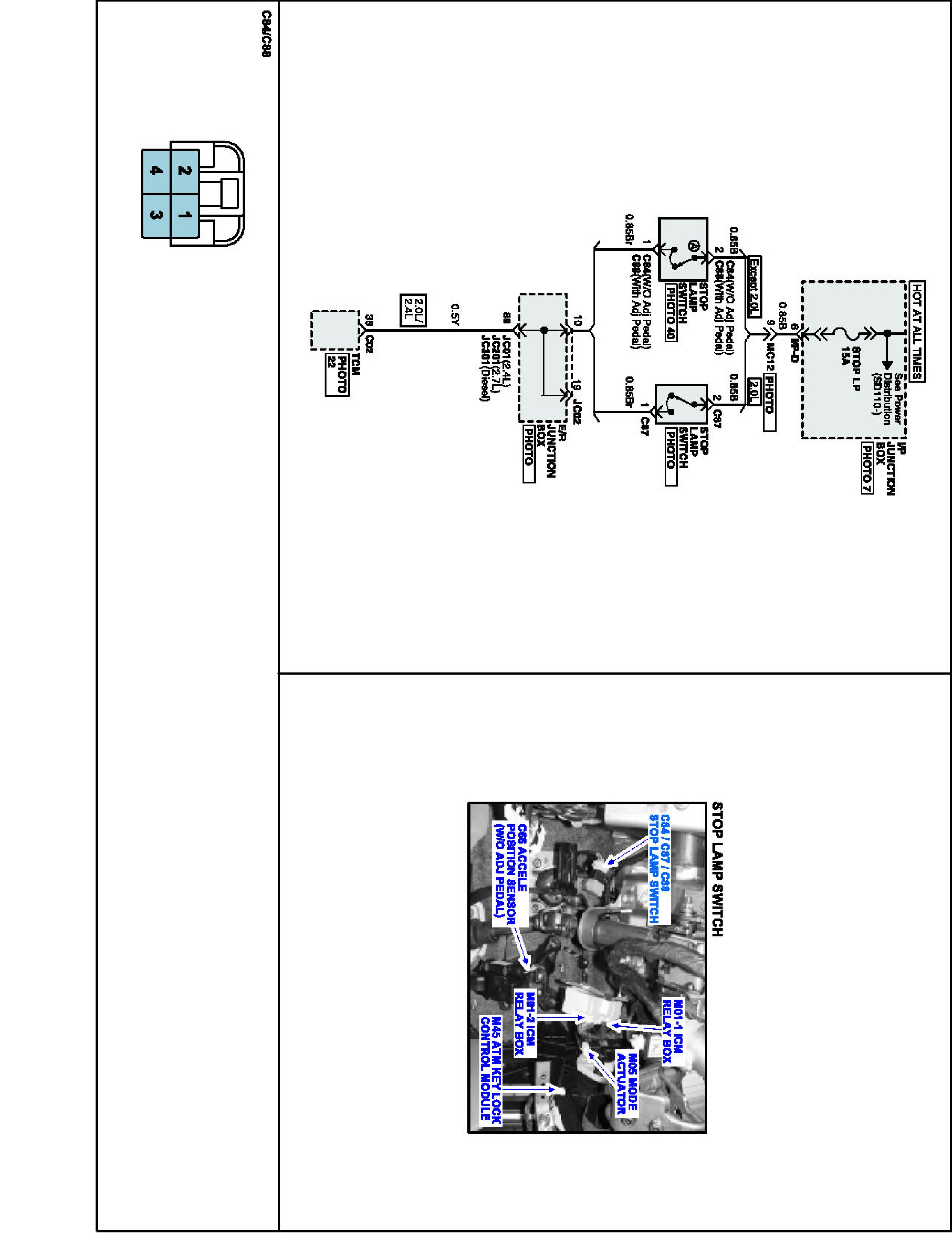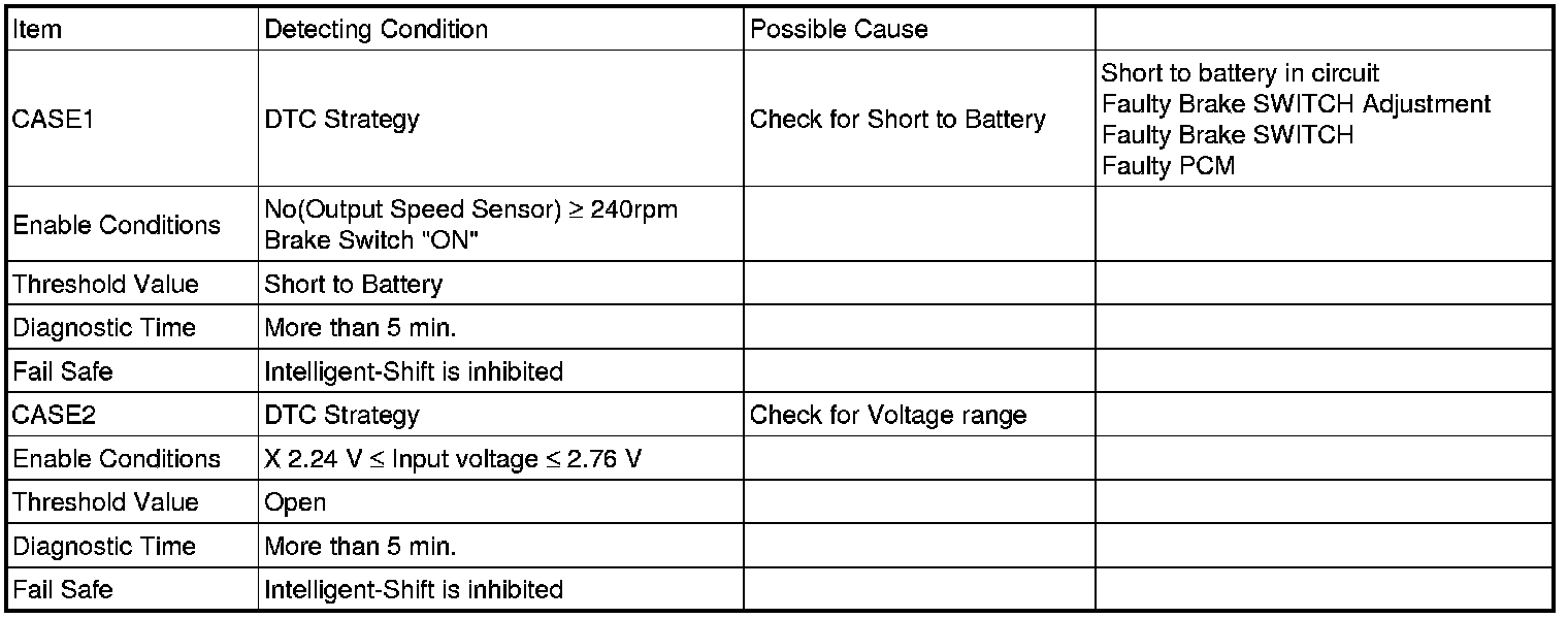 The TCM (PCM) sets this code if a Brake Switch signal is input continuously, for an extended period of time, when the vehicle is supposed to be running (moving).