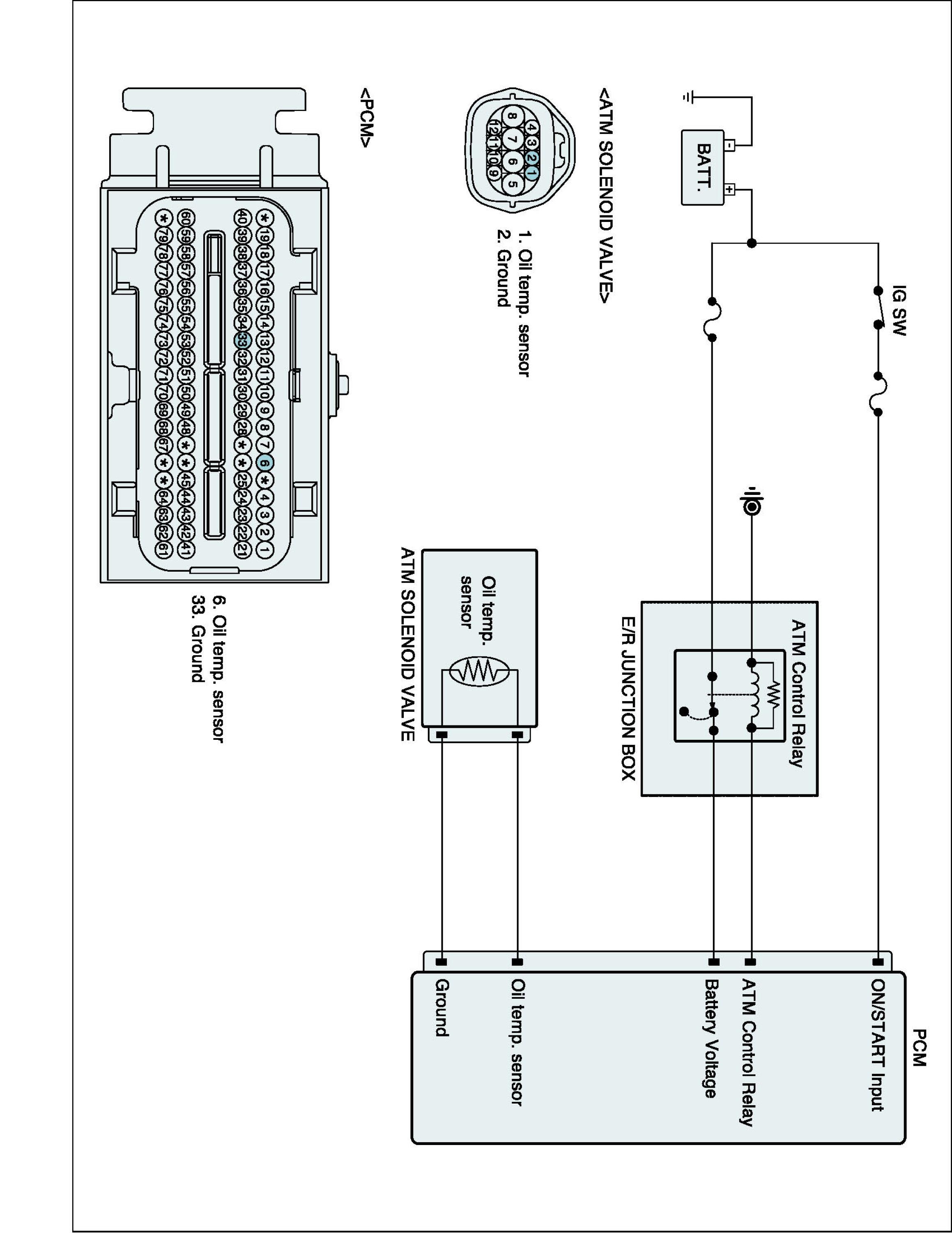 The automatic TRANSAXLE fluid (ATF) temperature sensor is installed in the Valve Body. This sensor uses a thermistor whose resistance changes according to the temperature changes. The TCM supplies a 5 V reference voltage to the sensor, and the output voltage of the sensor changes when the ATF temperature varies. The automatic transmission fluid (ATF) temperature provides very important data for the TCM's control of the Torque Converter Clutch, and is also used for many other purposes.