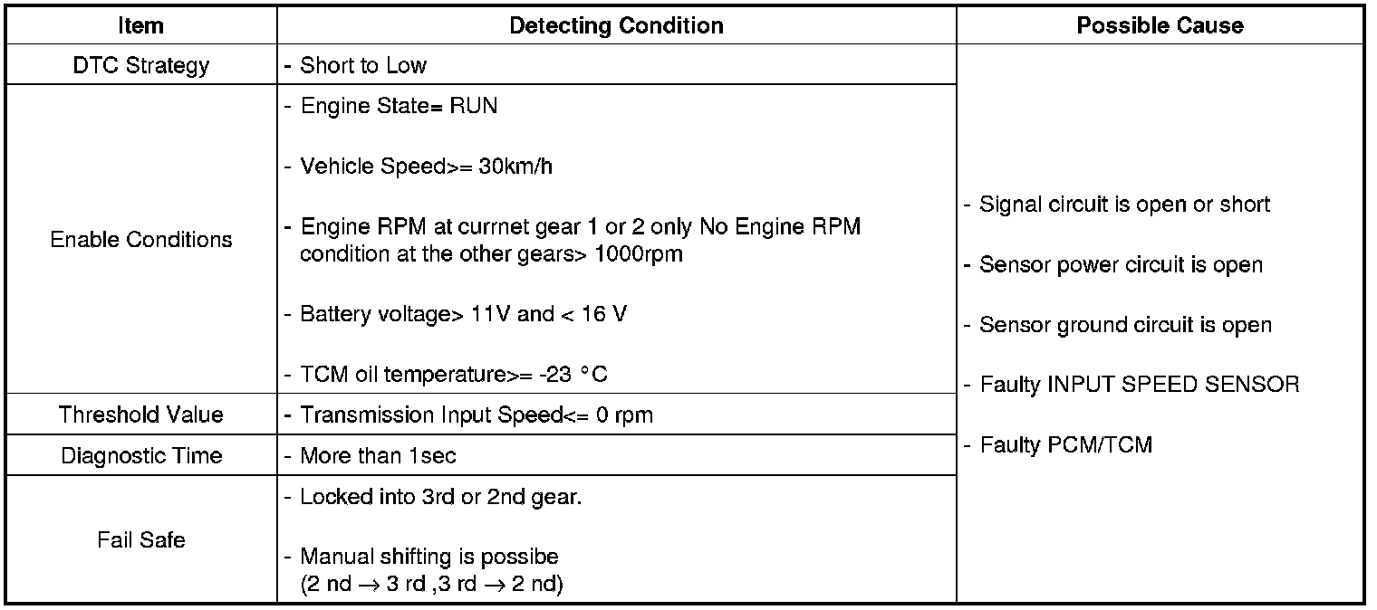 The TCM sets this code if an output pulse-signal is not detected, from the input speed sensor, when the vehicle is running faster than 30 km/h. The Fail-Safe function will be set by the TCM if this code is detected.