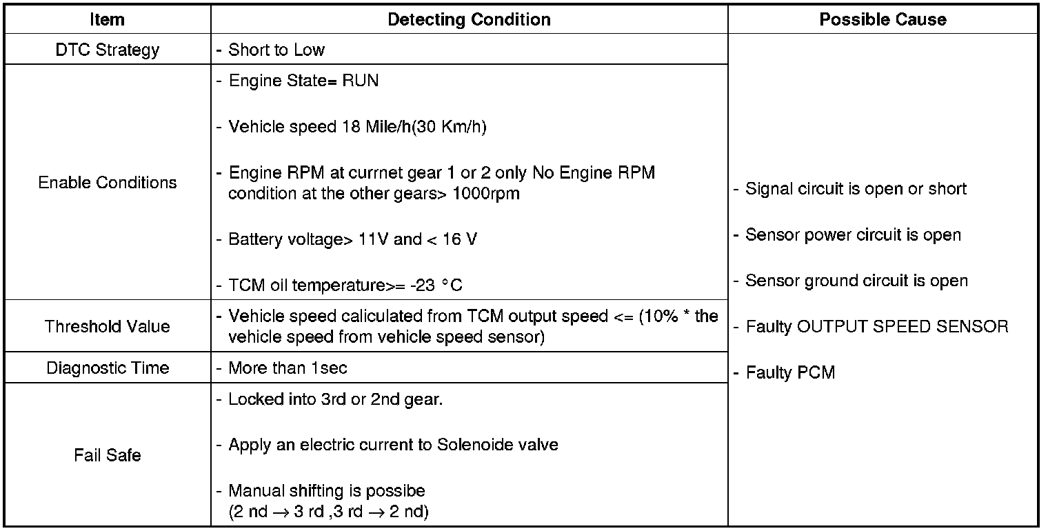 The TCM sets this code if the calculated value of the pulse-signal is noticeably different from the value calculated, using the Vehicle Speed Sensor output, when the vehicle is running faster than 30 km/h. The TCM will initiate the fail safe function if this code is detected.