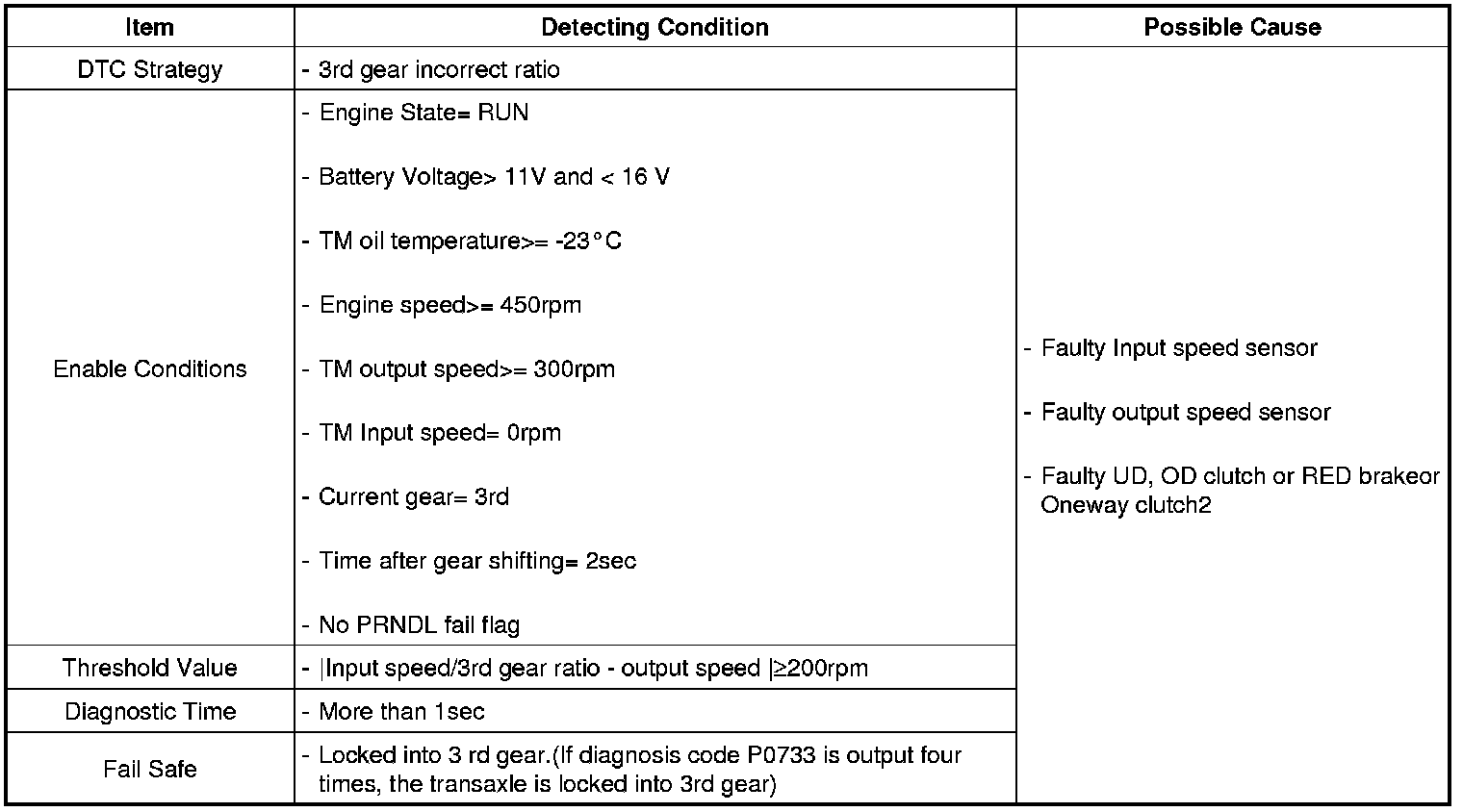 This code is set if the value of input shaft speed is not equal to the value of the output shaft, when multiplied by the 3rd gear ratio, while the transaxle is engaged in 3rd gear. This malfunction is mainly caused by mechanical troubles such as control valve sticking or solenoid valve malfunctioning rather than an electrical issue.