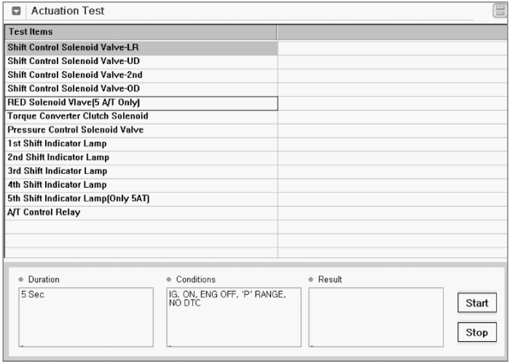 3. Select A/T Solenoid valve Actuator test and Operate Actuator test.
