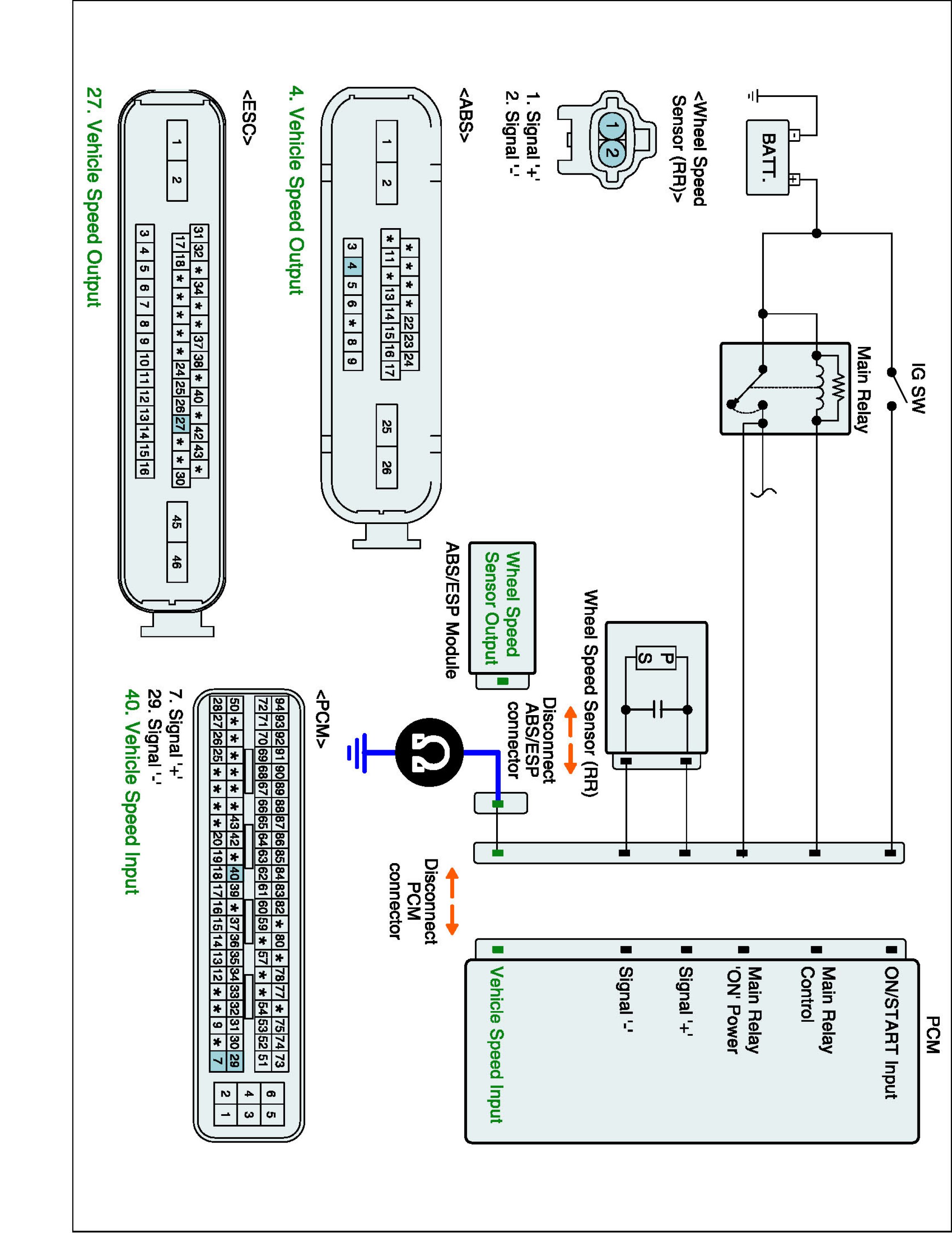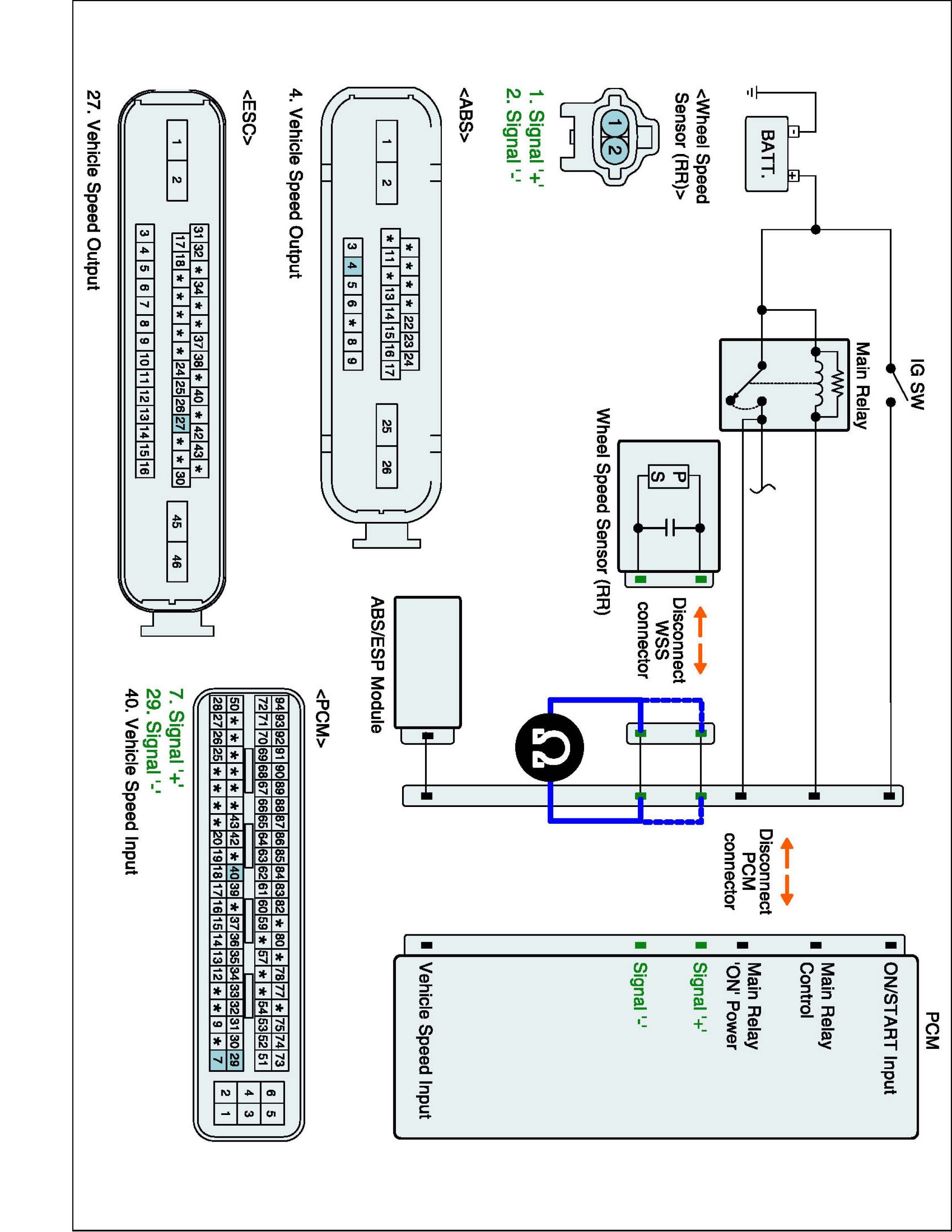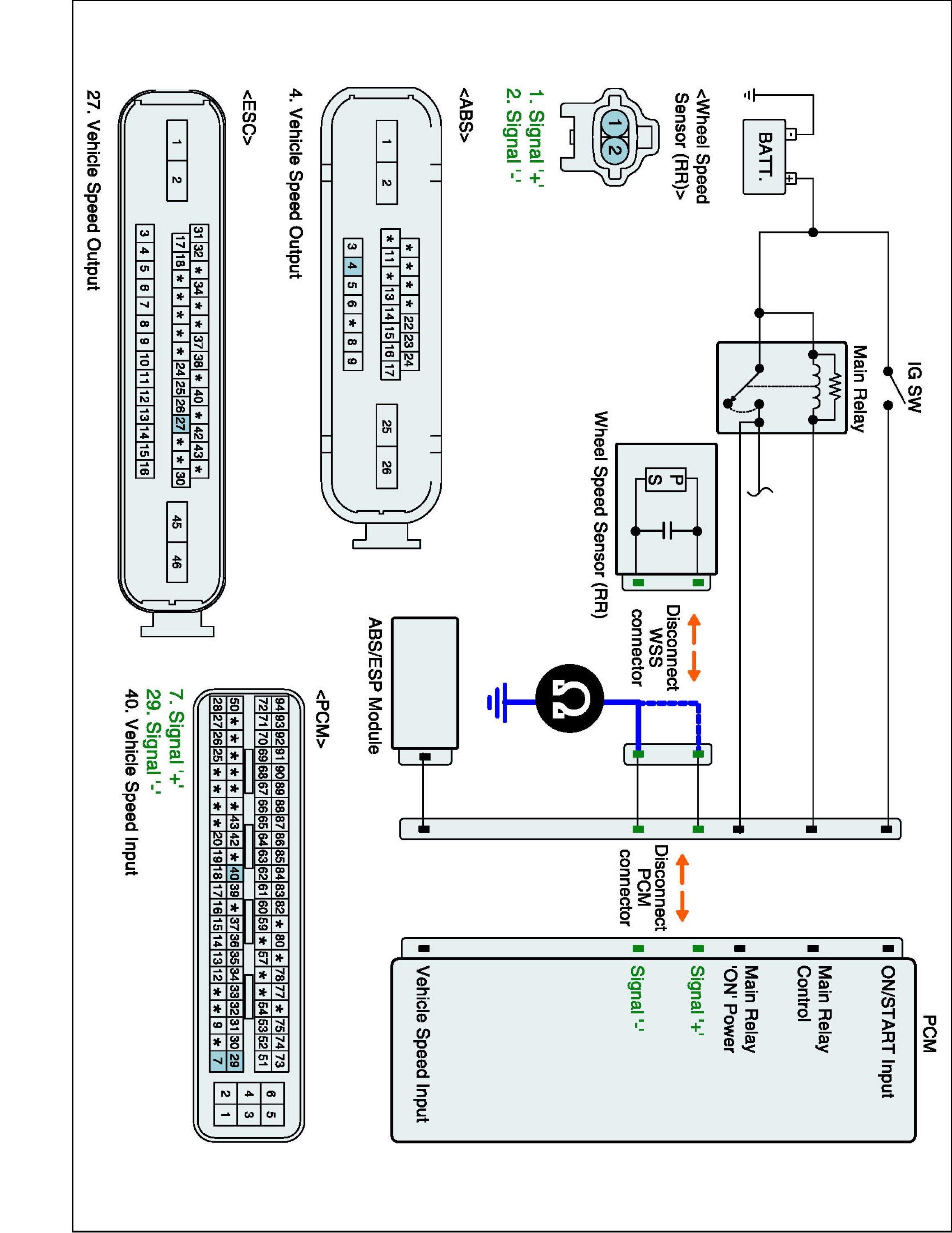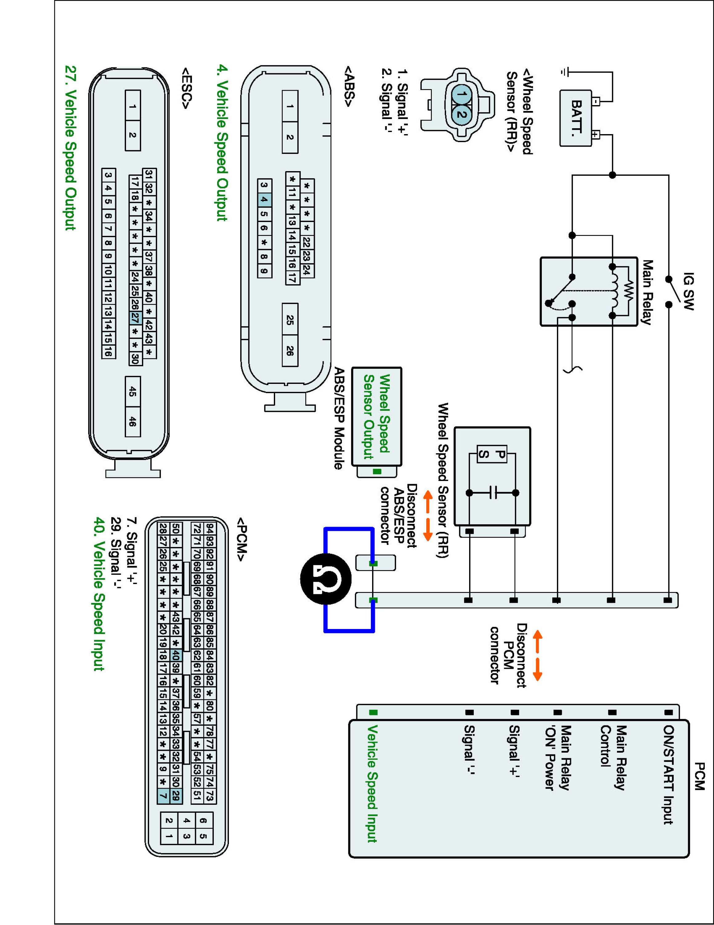 (2) Measure resistance between Vehicle speed input terminal of PCM harness connector and Vehicle speed output terminal of ABS/ESP Control Module harness connector.