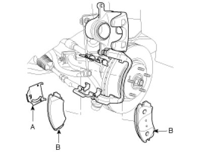 3. Install the brake pads (B) and pad shims (A) on the pad retainer correctly. Install the pad with the wear indicator on the inside. If you are reusing the pads, always reinstall the brake pads in their original positions to prevent a momentary loss of braking efficiency.
