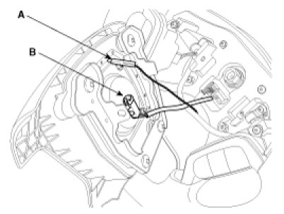 4. Release the connector locking pin, then disconnect the driver airbag module connector(B).