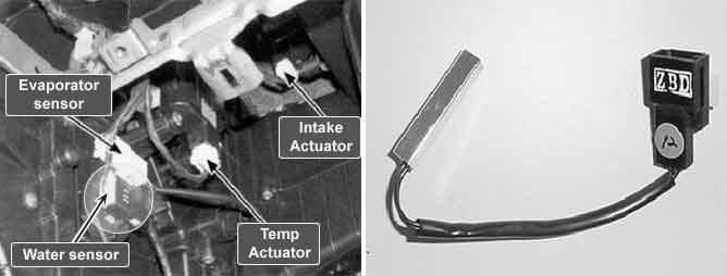 A water temp sensor located at heater unit detects coolant temperature. It contains negative type the mistor whose resistance value is in inverse proportion to temperature. Resistance of watersensor that varies with temperature makes signal voltage of A/C ECU change. In this way A/C ECU detects temperature. Signal of water sensor is used for cold engine lockout control - When the driver operates the heater before the engine is warmed up enough, to prevent driver from unpleasantness of cold air. the heater control unit reduces blower motor speed until coolant temperature reaches the threshold value.