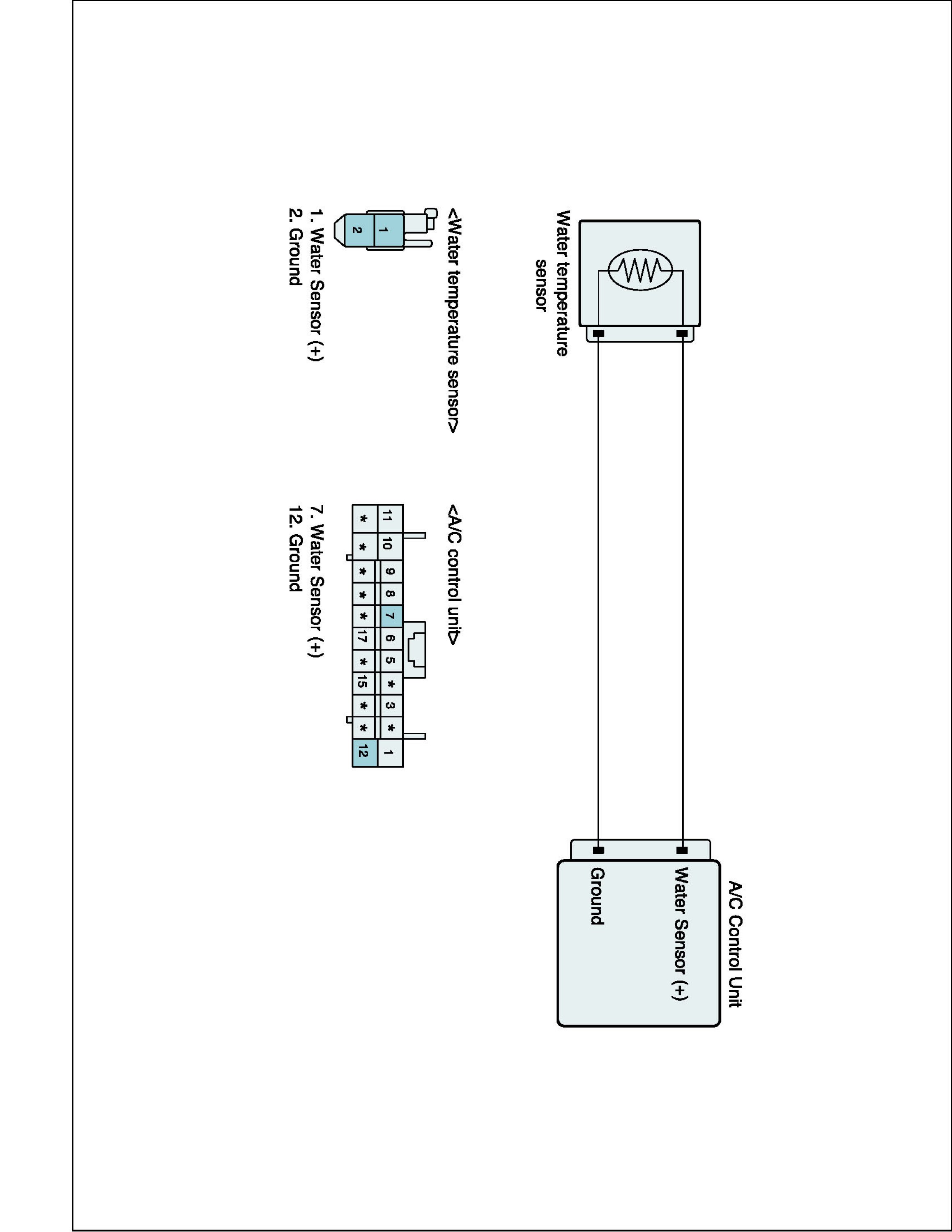 Air conditioner Control Module sets DTC B1202 if water temperature sensor has been detected over 4.9 V for 4 seconds.