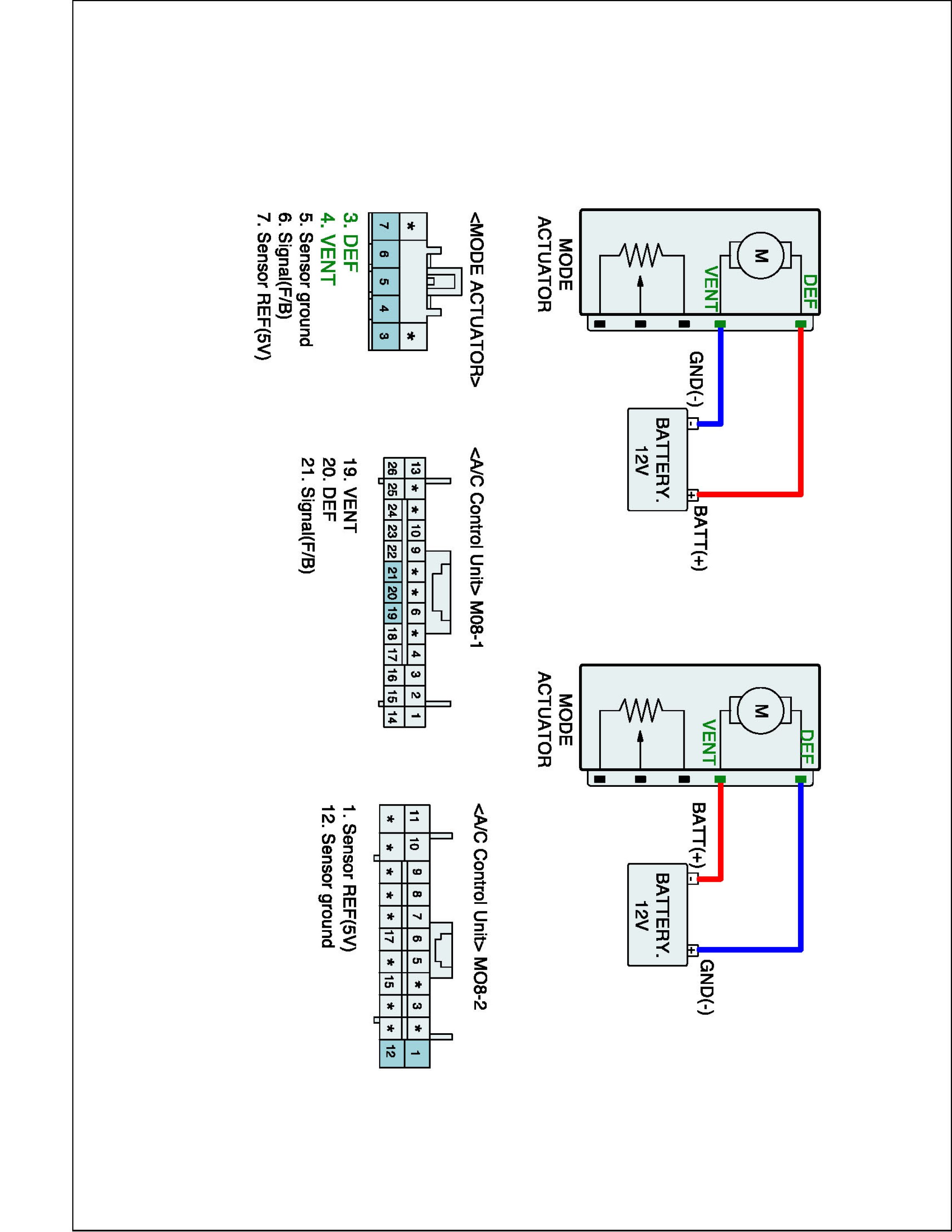 5. Verify that the temperature actuator operates to the warm position with reverse connecting. (DEF (+) and VENT (-)). (Component side)