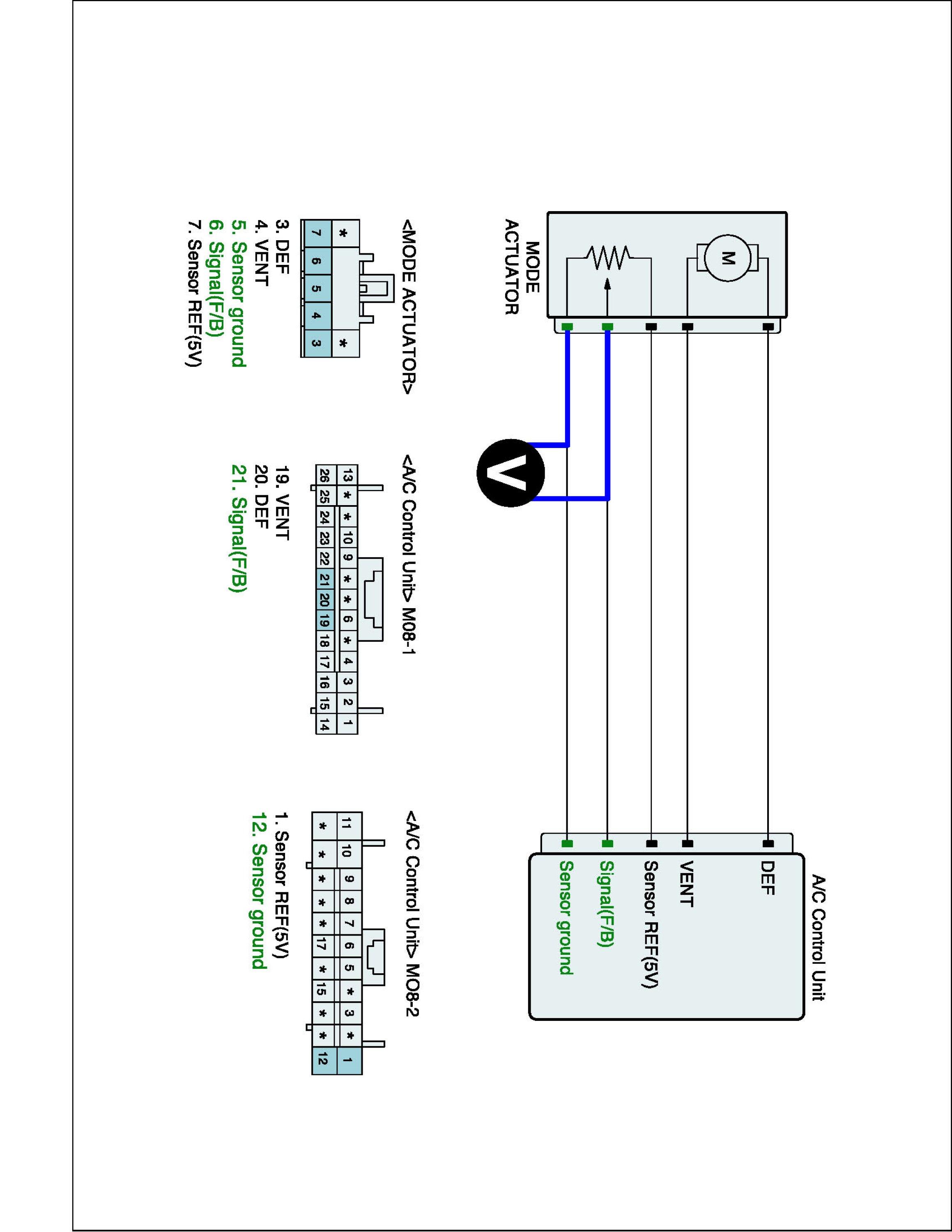 4. Measure voltage between Signal (F/B) terminal of Driver Direction actuator harness connector and Sensor ground (-) terminal of A/C-ECU harness connector. (Component side)