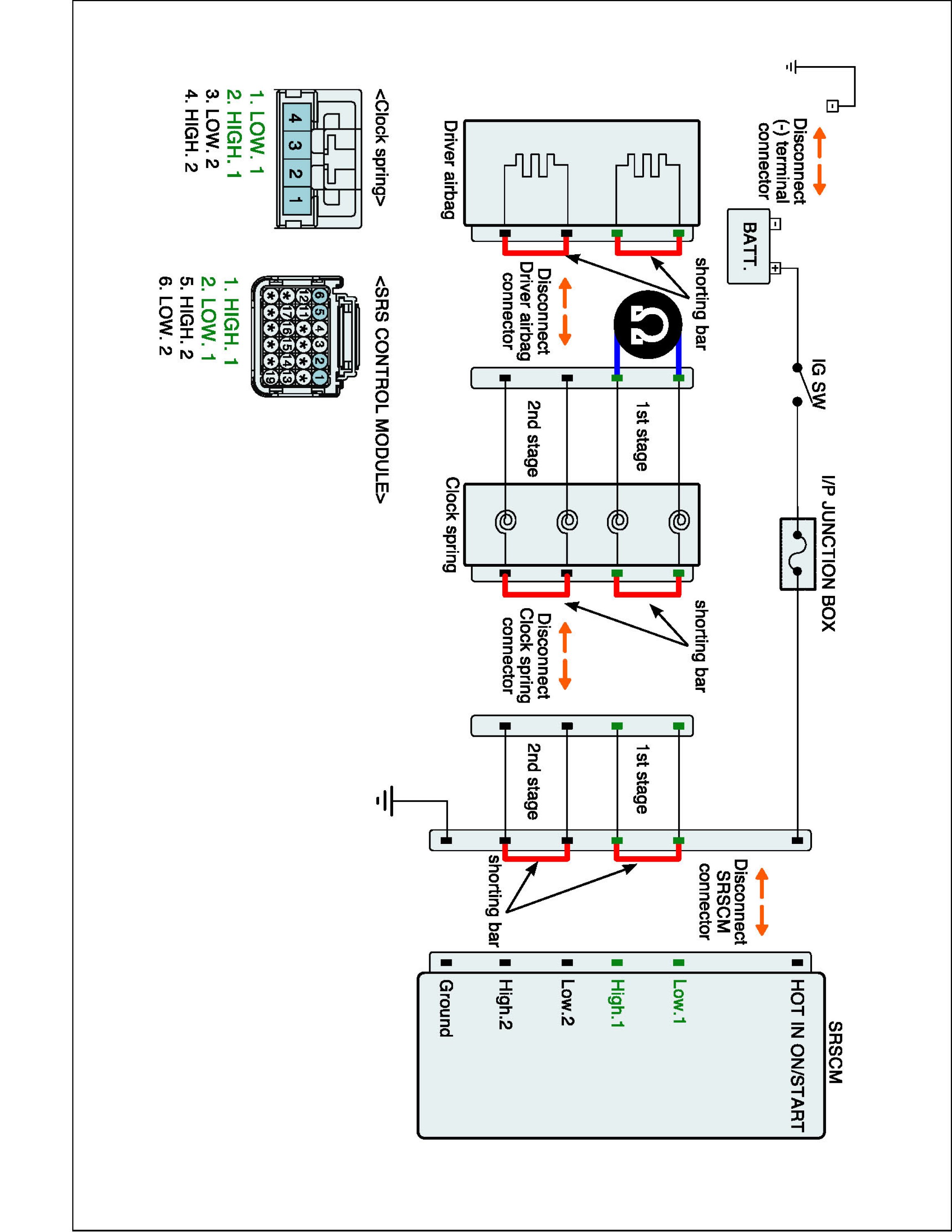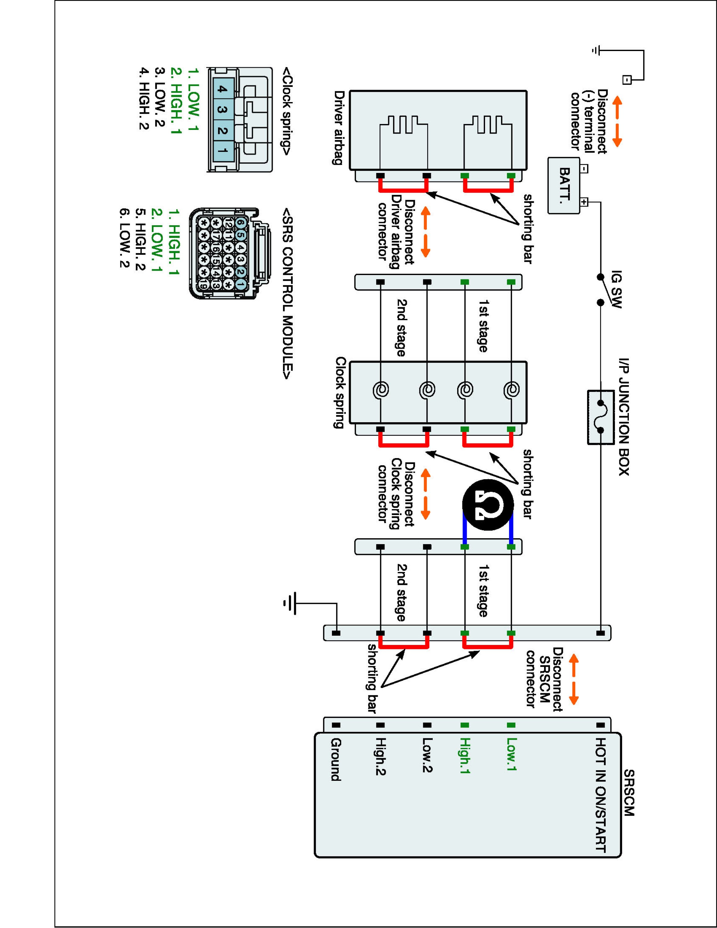 4. Measure resistance between terminal "Low.1" and "High.1" of the Clock Spring harness connector.