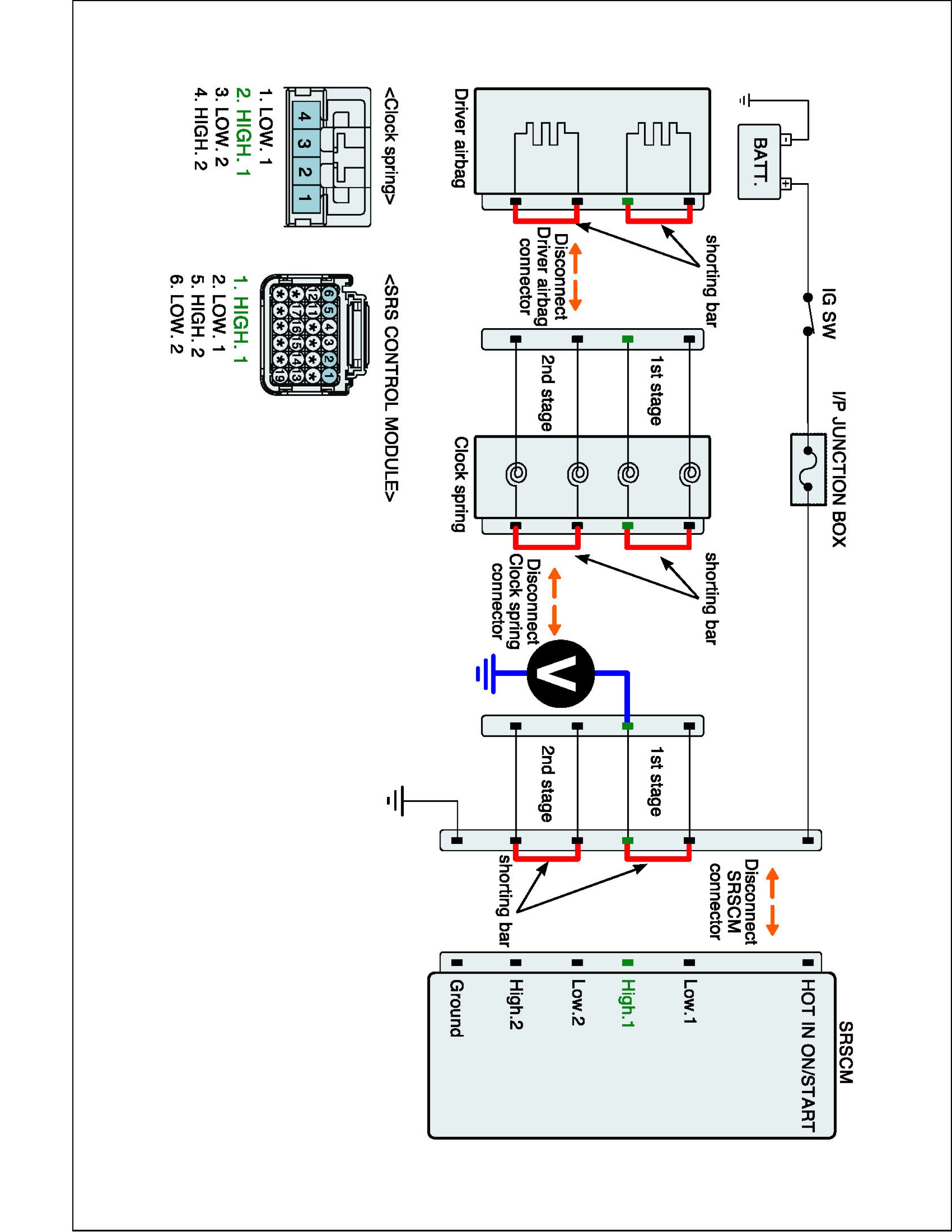 5. Measure Voltage between terminal "Low.1" or "High.1" of the clock spring harness connector and chassis ground.