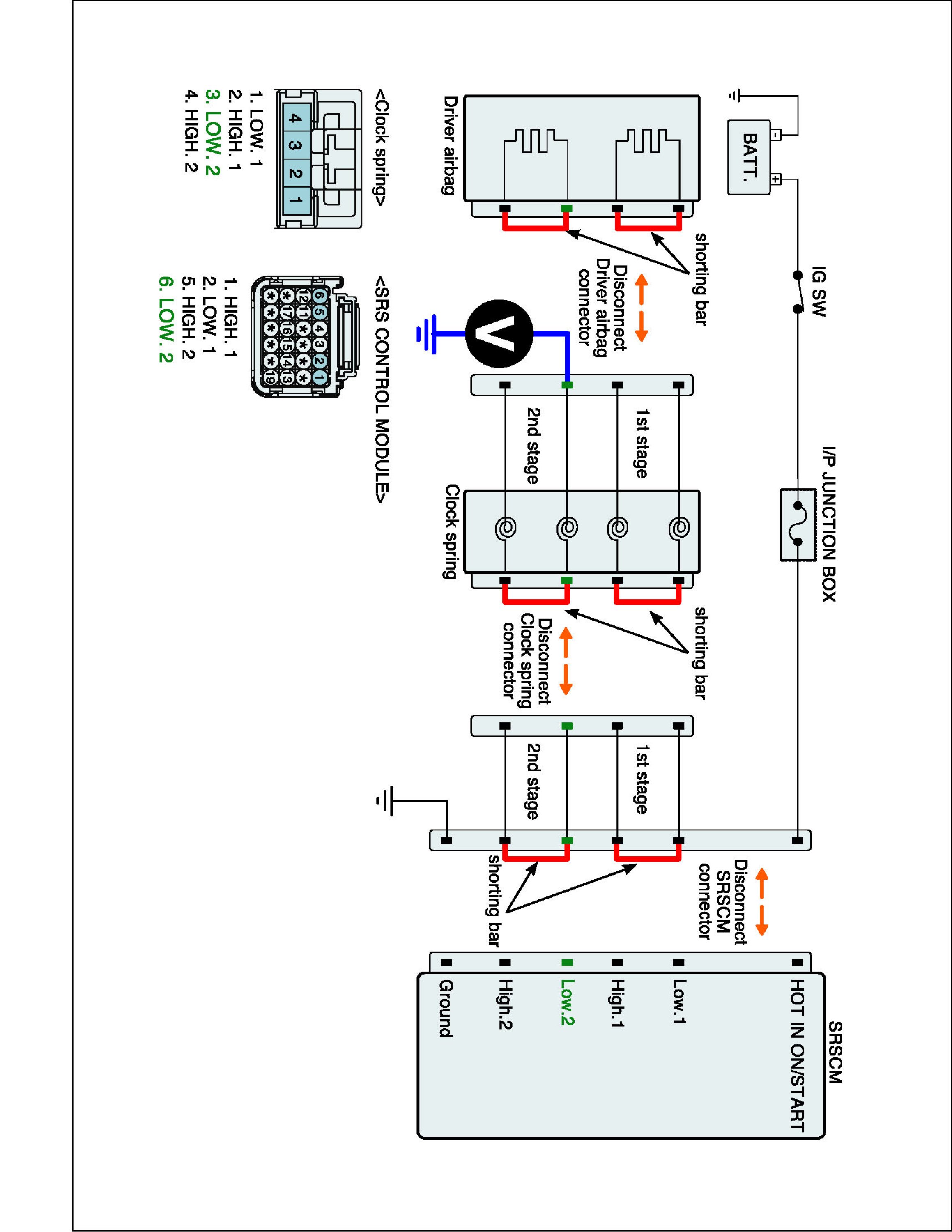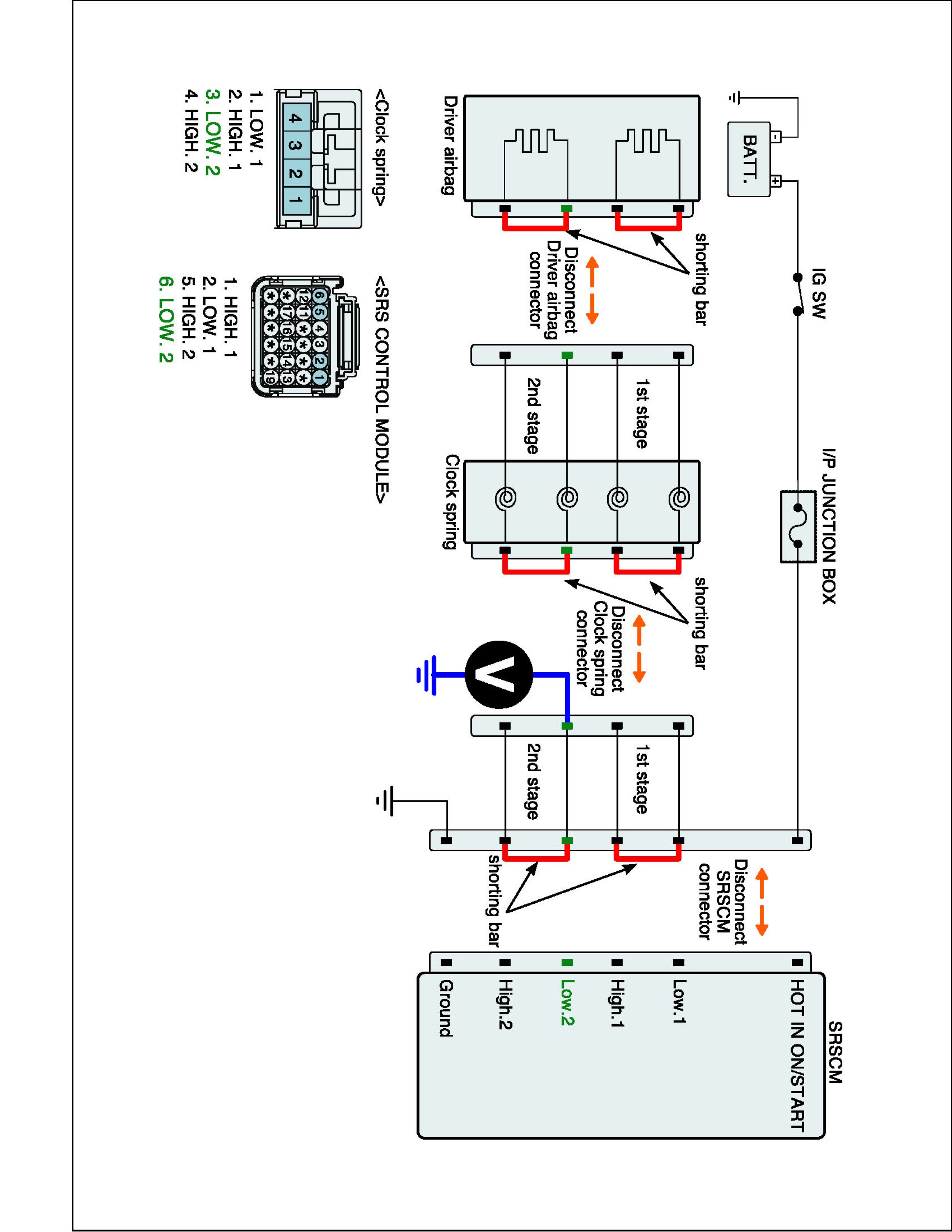 5. Measure Voltage between terminal "Low.2" or "High.2" of the clock spring harness connector and chassis ground.