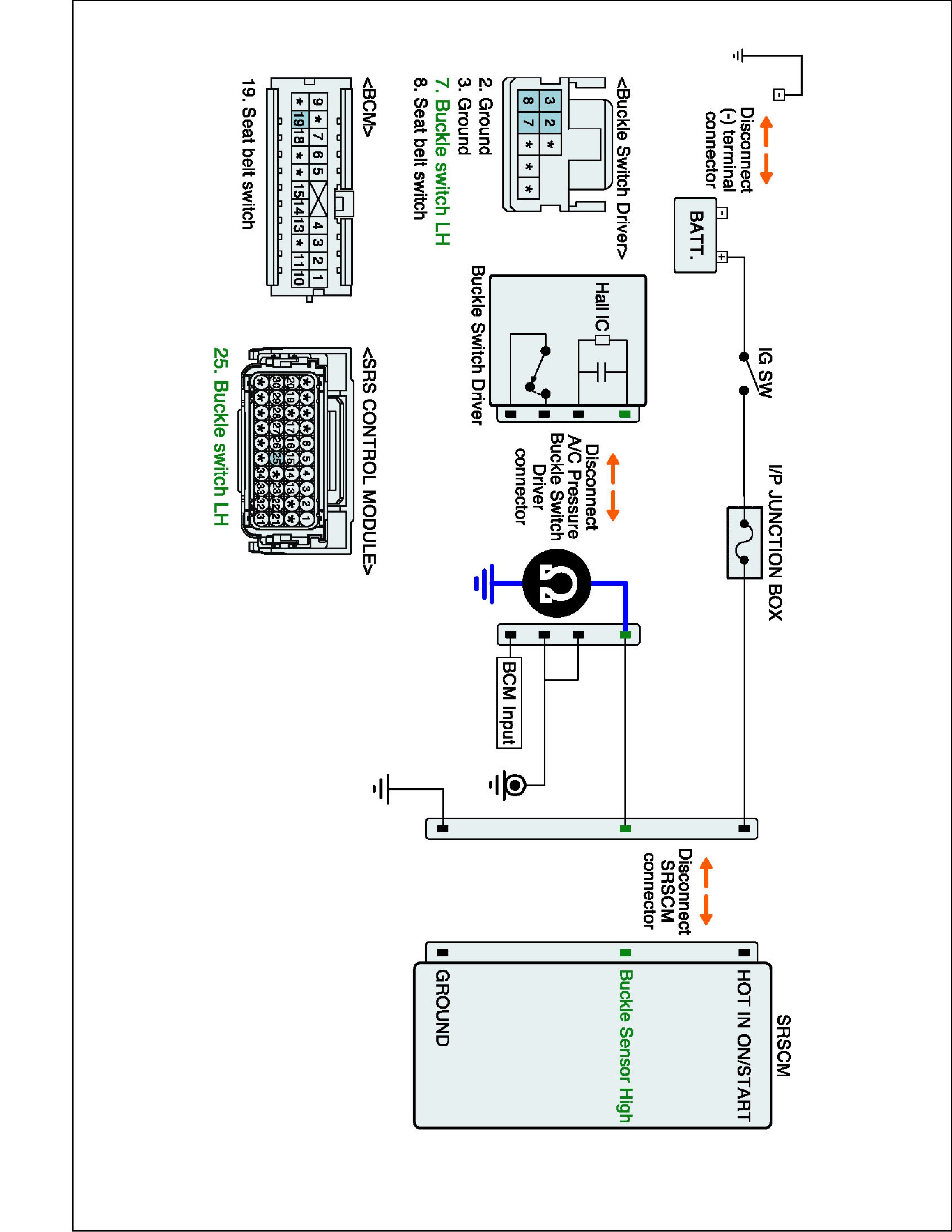 3. Disconnect Seat-belt Buckle Switch connector and SRSCM main harness connector.