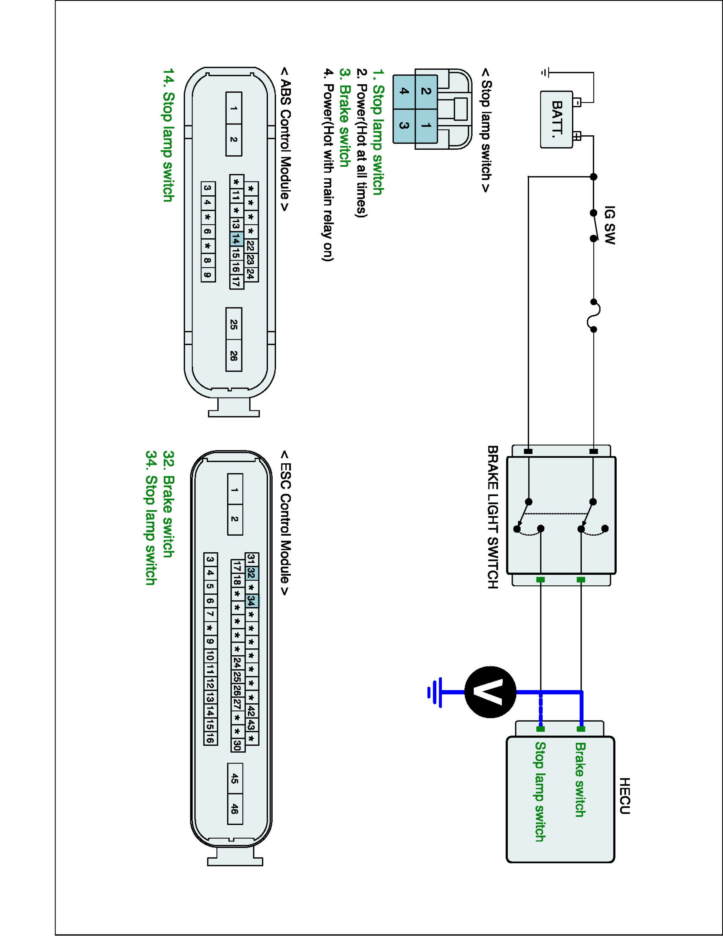 3. Measure voltage between stop lamp switch (brake switch) terminal of the HECU harness connector and chassis ground.