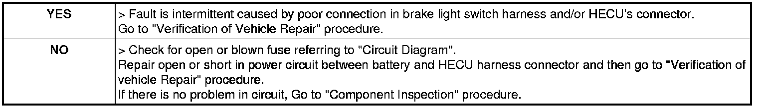 2. Measure voltage between stop lamp switch (brake switch) terminal of the HECU harness connector and chassis ground.