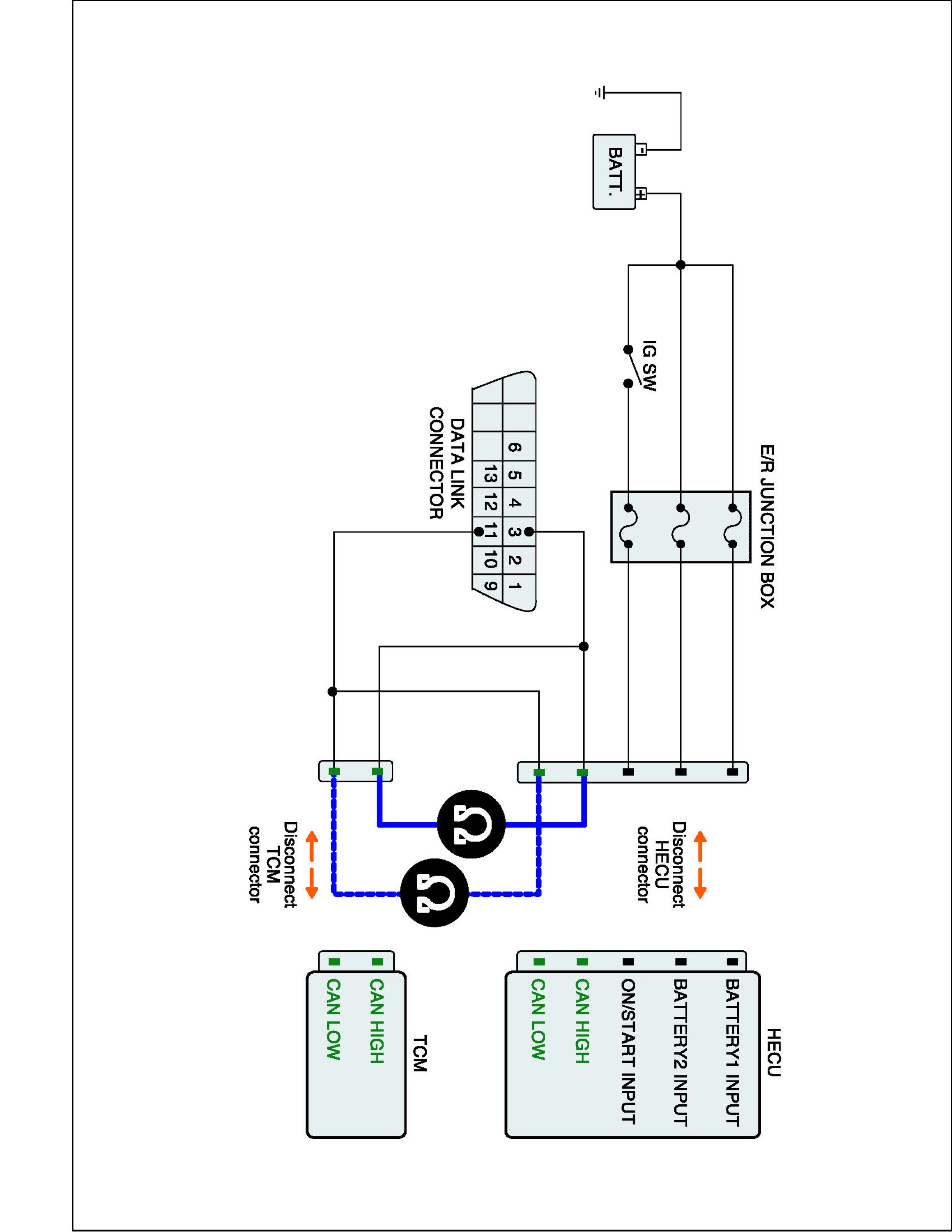 3. Measure resistance between CAN HIGH, LOW terminal of the HECU harness connector and CAN HIGH, LOW terminal terminal of the TCM harness connector.