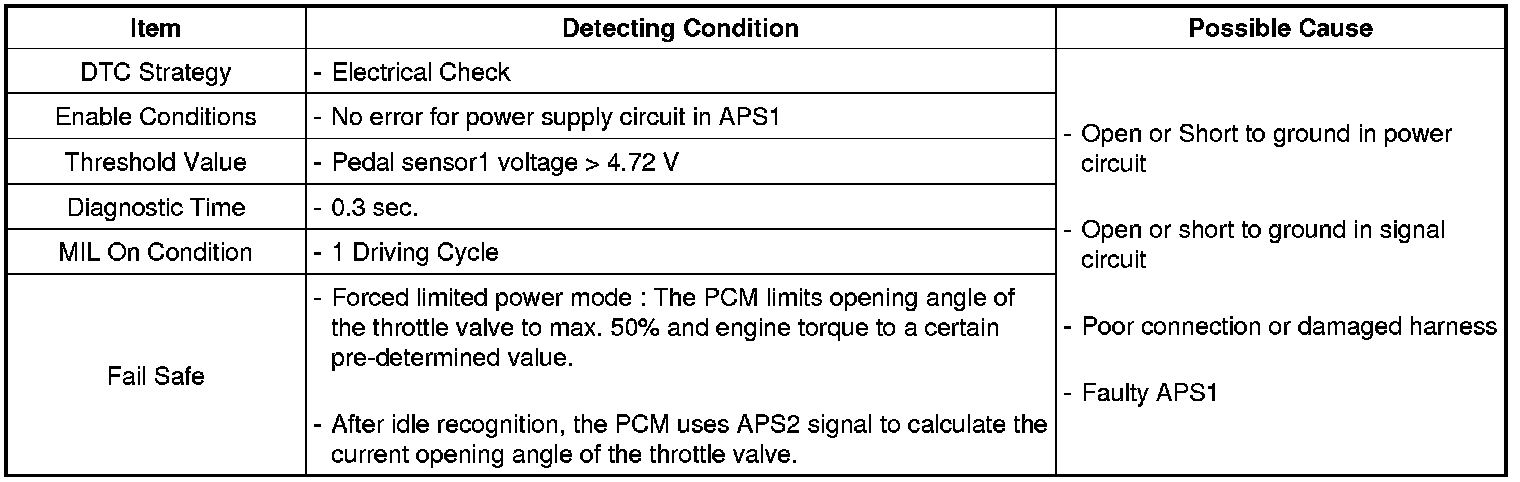 PCM sets DTC P2123 if the PCM detects output voltage higher than the possible range of a properly operating APS1.