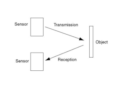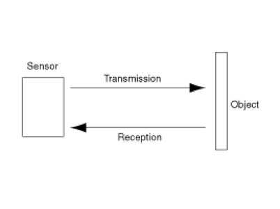 The sensor emits ultrasonic wave to the objects, and it measures the time until reflected wave returns, and calculates the distance to the object.