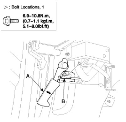 1. Remove the mounting bolt, then remove the hood release handle (A).