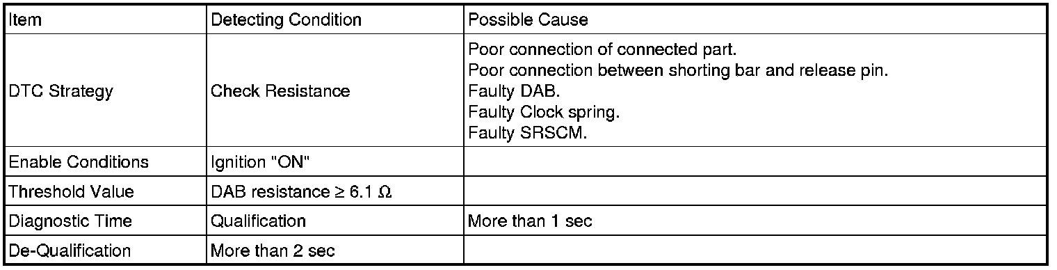 The SRSCM sets DTC B1346 if the measured resistance value of DAB circuit is more than the threshold value.