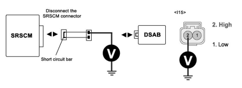 5. Measure voltage between terminal "1 or 2" of the DSAB harness connector and chassis ground.