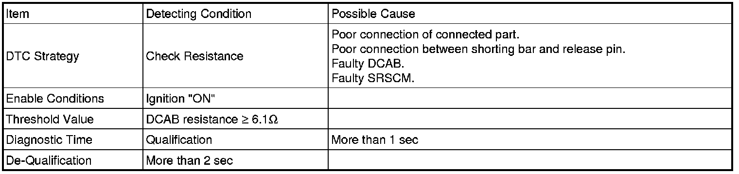 The SRSCM sets DTC B1473 if the measured resistance value of DCAB circuit is more than the threshold value.