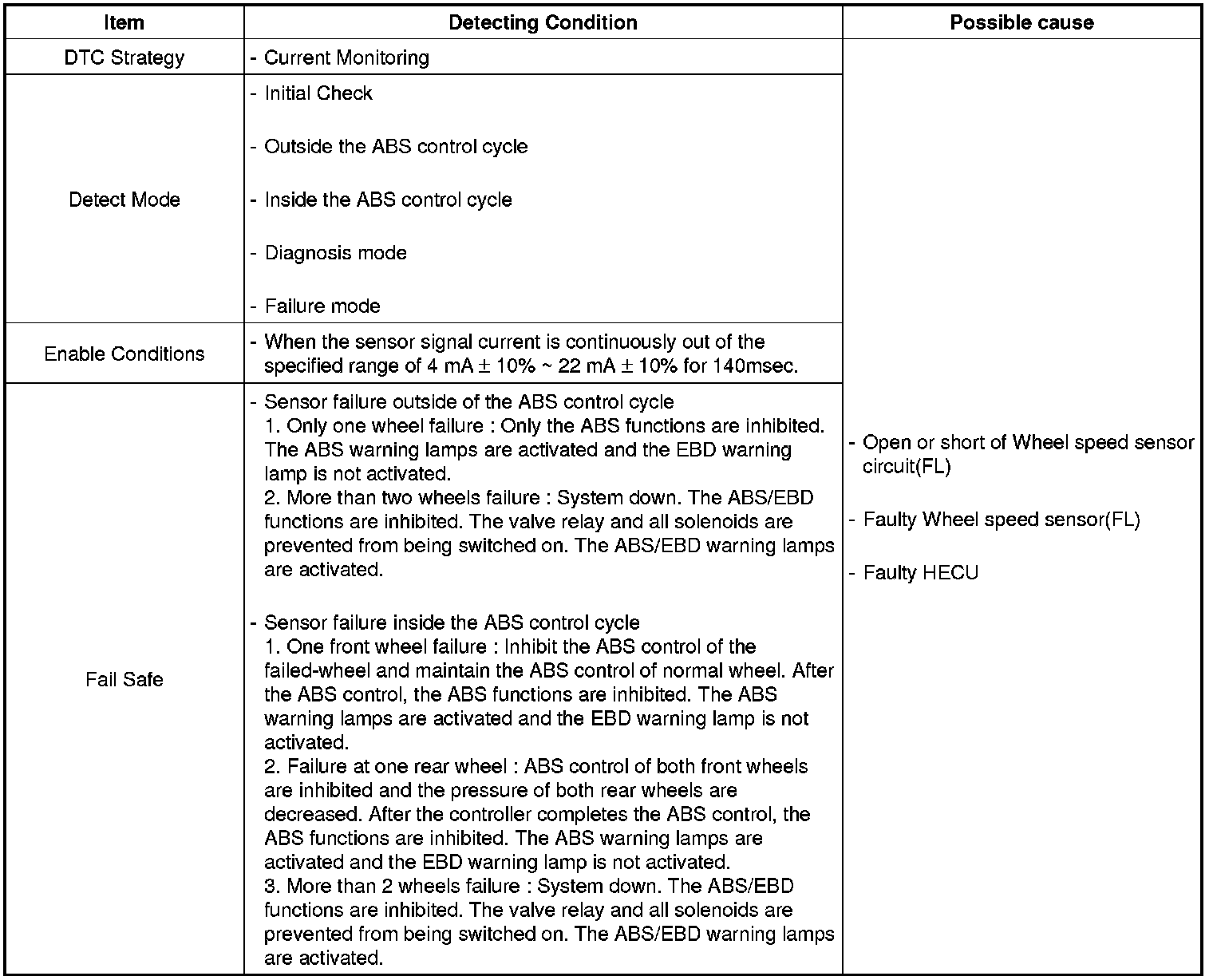 If the sensor signal current is continuously out of the specified range for 140msec, then the HECU determines that the circuit is open/short, and sets this code.