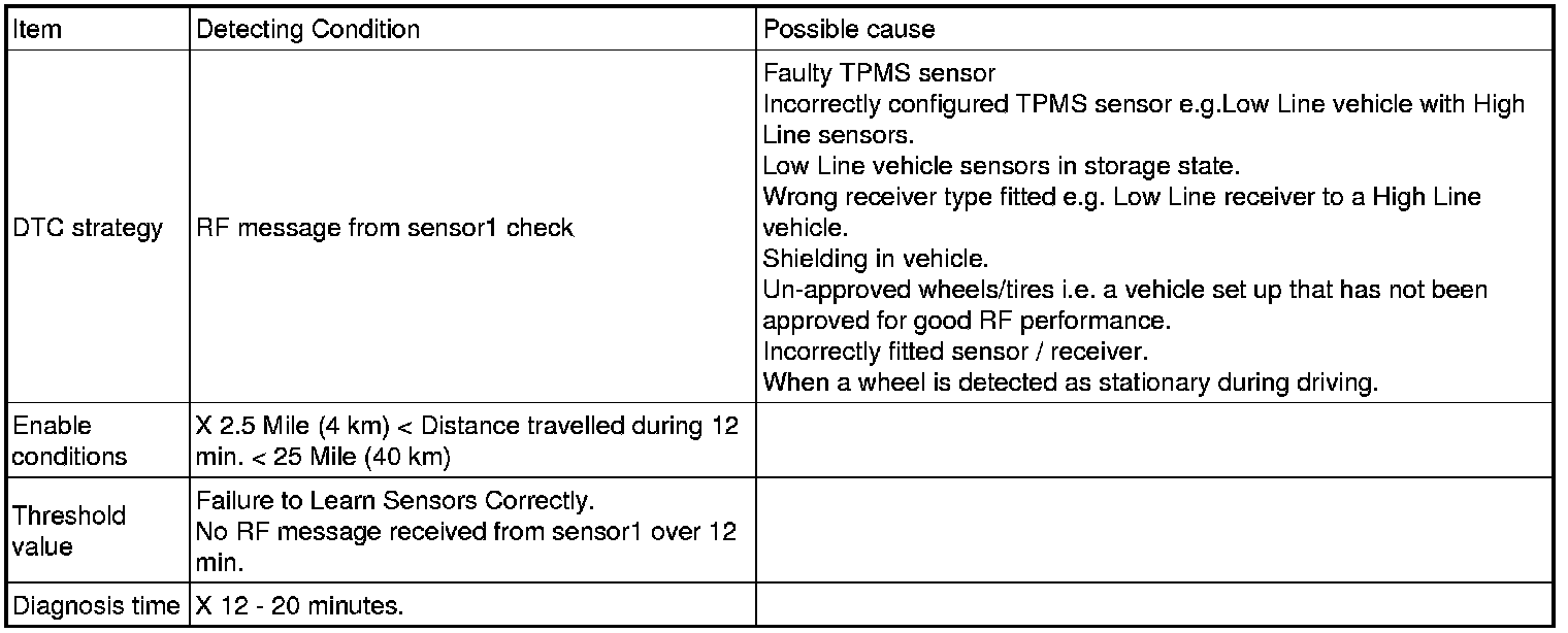 When 4 sensors have been learned as road wheels, it shall not be possible to learn new road wheel sensors on the same Ignition cycle. In normal mode low line, tire pressure and temperature shall be transmitted every 3 minutes 20s nominally independent of vehicle operation. Monitoring shall be every 20s. If sensor detects rapid deflation, then RF messages will be transmitted every 4s for 1 minute duration. Communication from wheel sensors shall be via RF at a frequency of 315 MHz, 5 kBaud.
