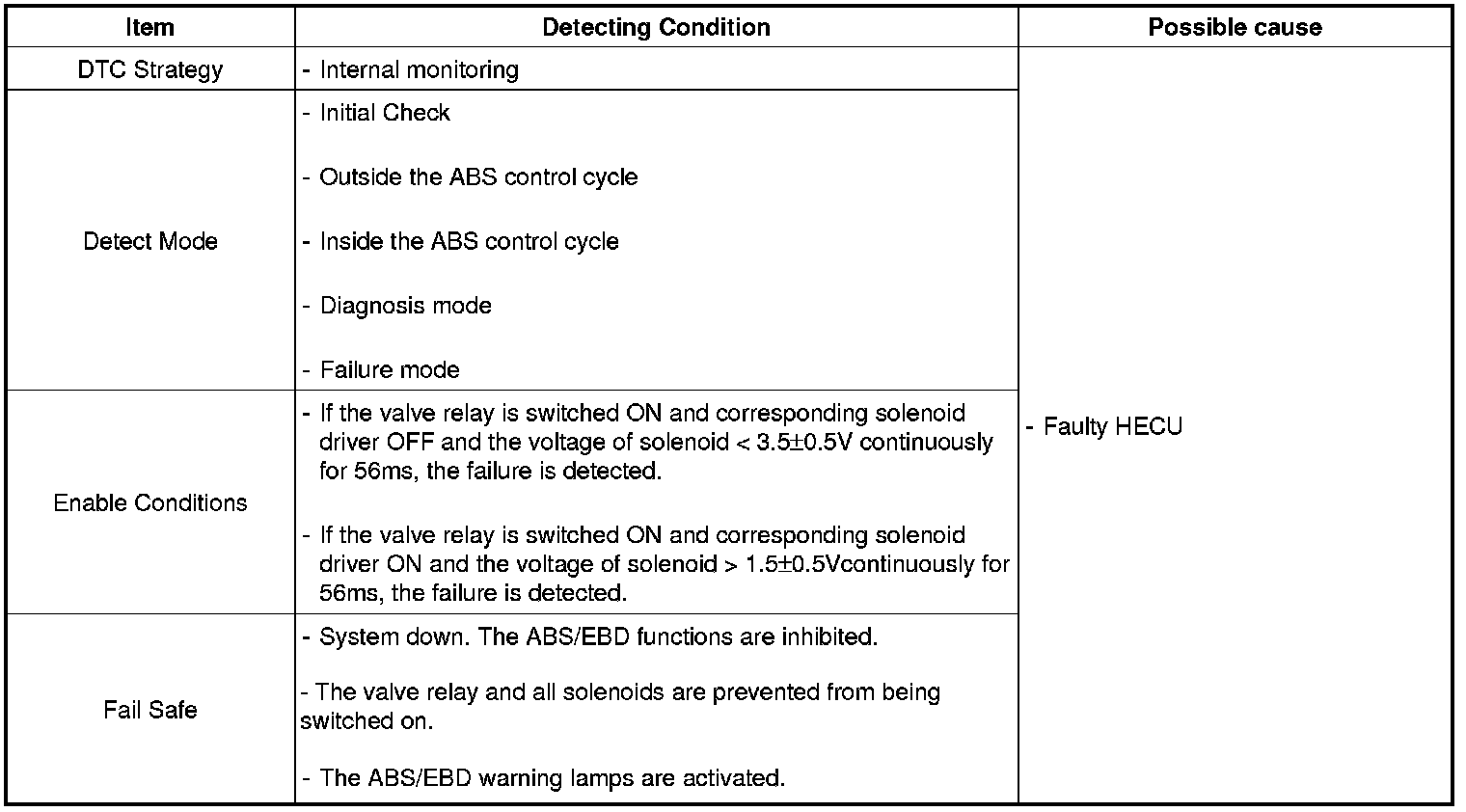 The HECU monitors the operation of the valves by checking the drive circuit of the solenoid valves, and then sets this code when the unexpected drive voltage is detected.