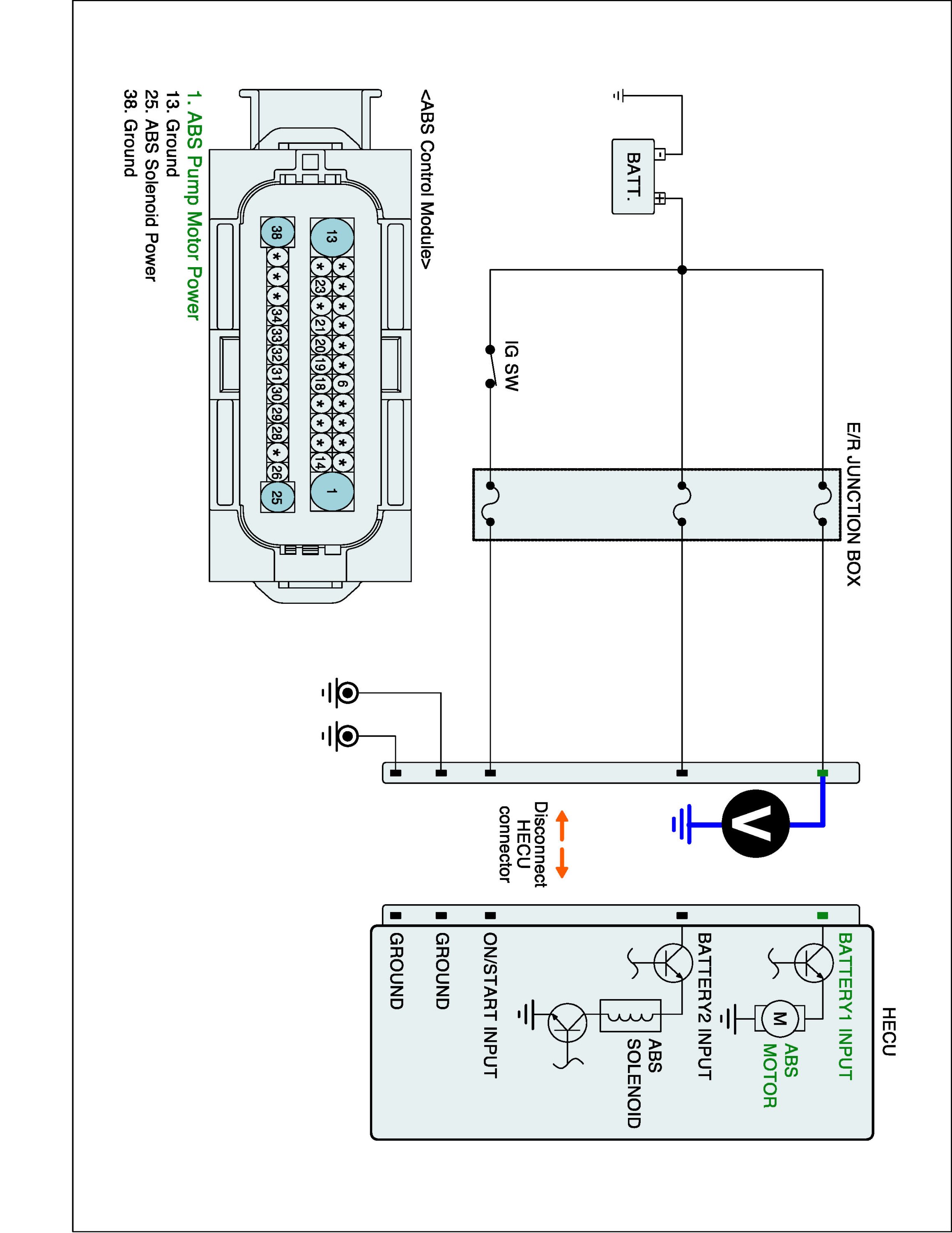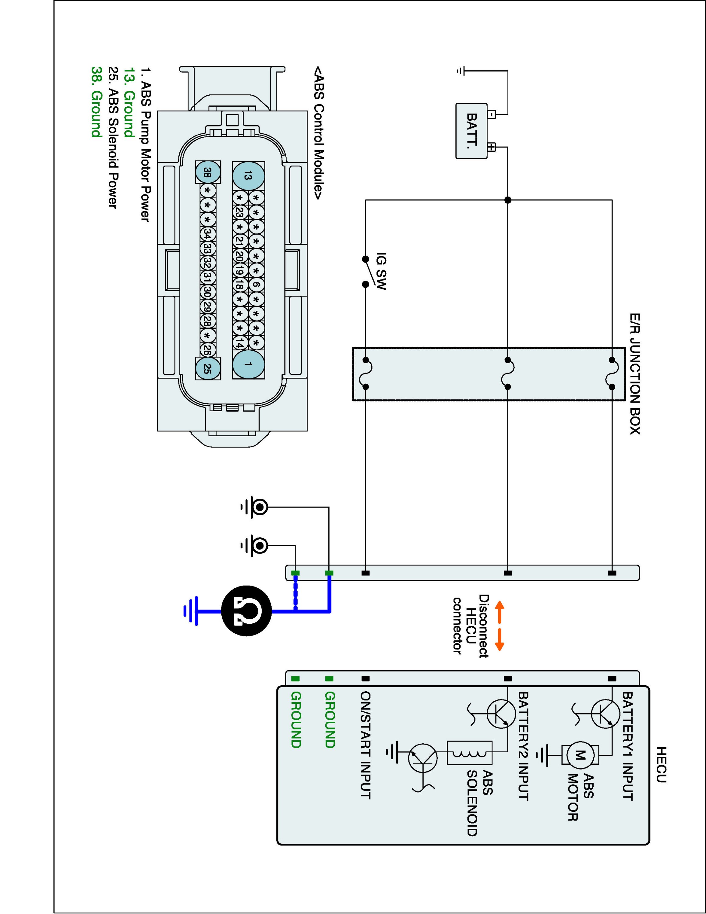 4. Measure voltage between power (ABS1) terminal of the HECU harness connector and chassis ground.